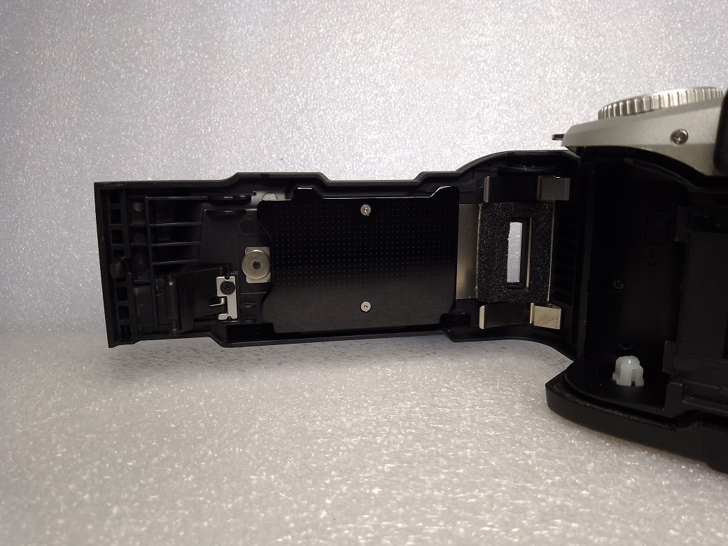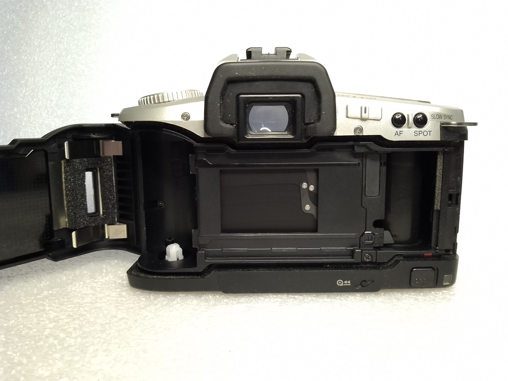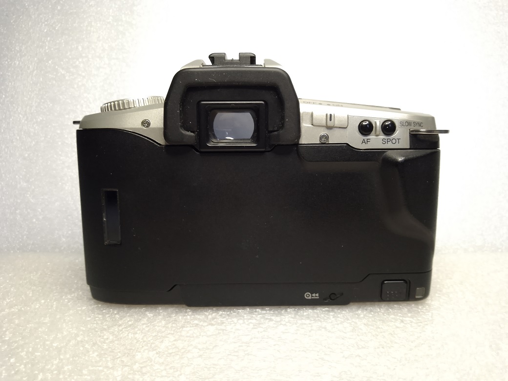 Rückseite: Sucher mit Einblendungen, Hauptschalter "ON / OFF", Spot AF-Taste, Spot Belichtungsmessung, klappbare Rückwand mit Filmandruckplatte und Sichtfenster, Taster für manuelle Filmrückspulung, Rückwandentriegelung