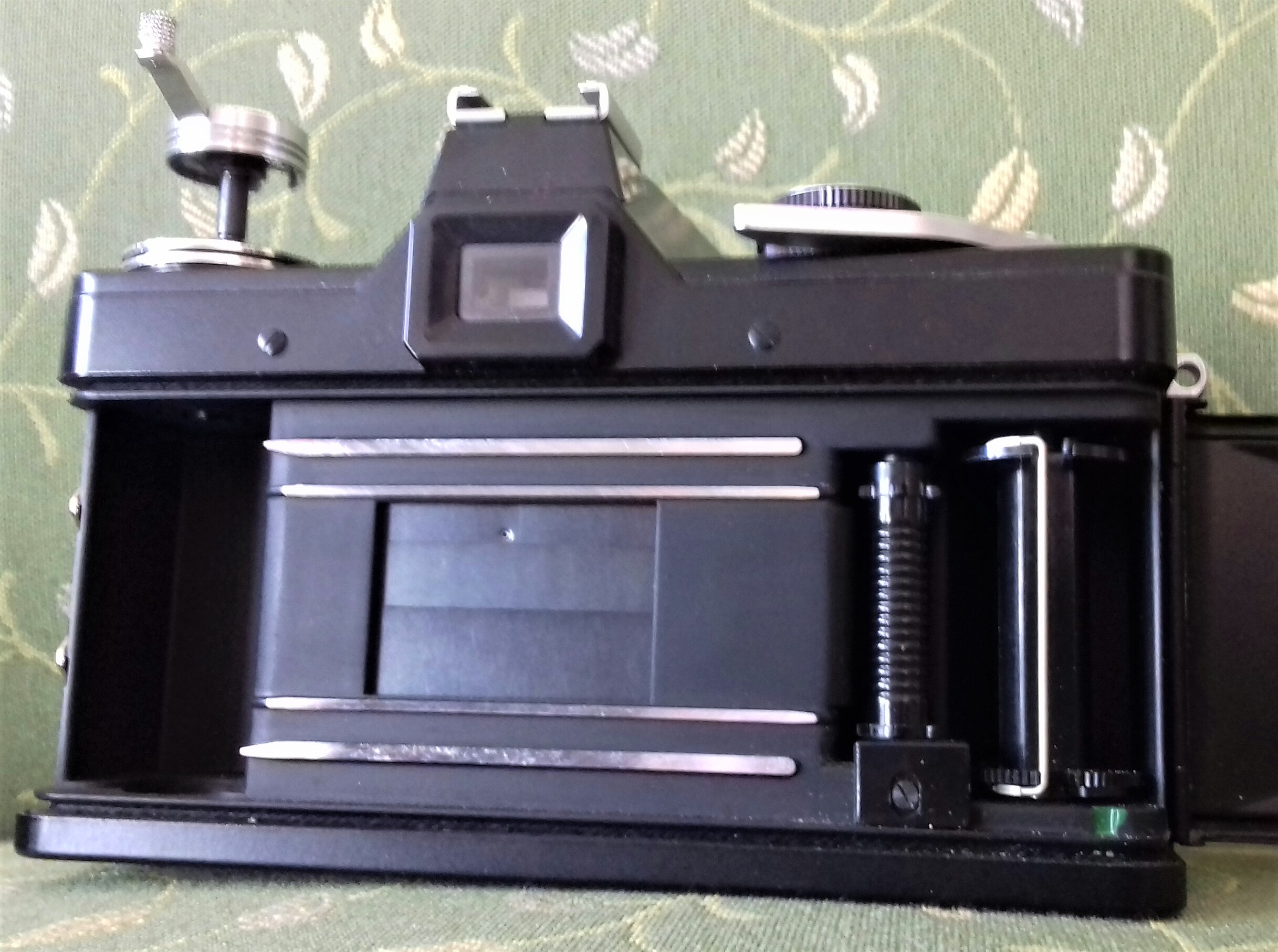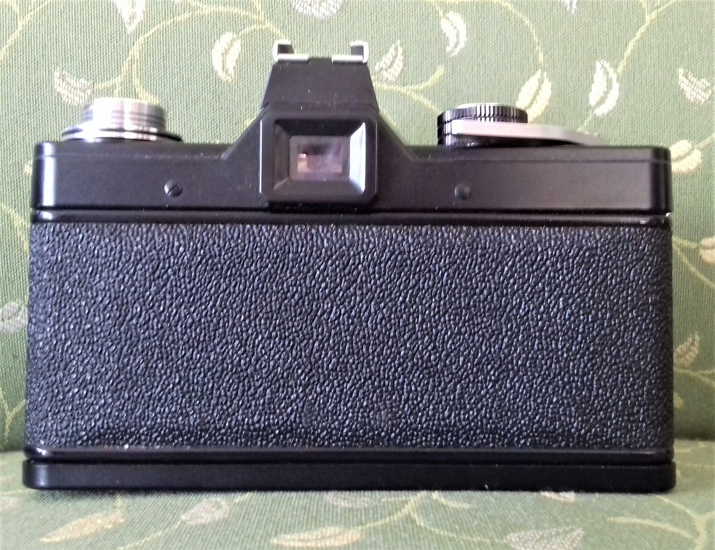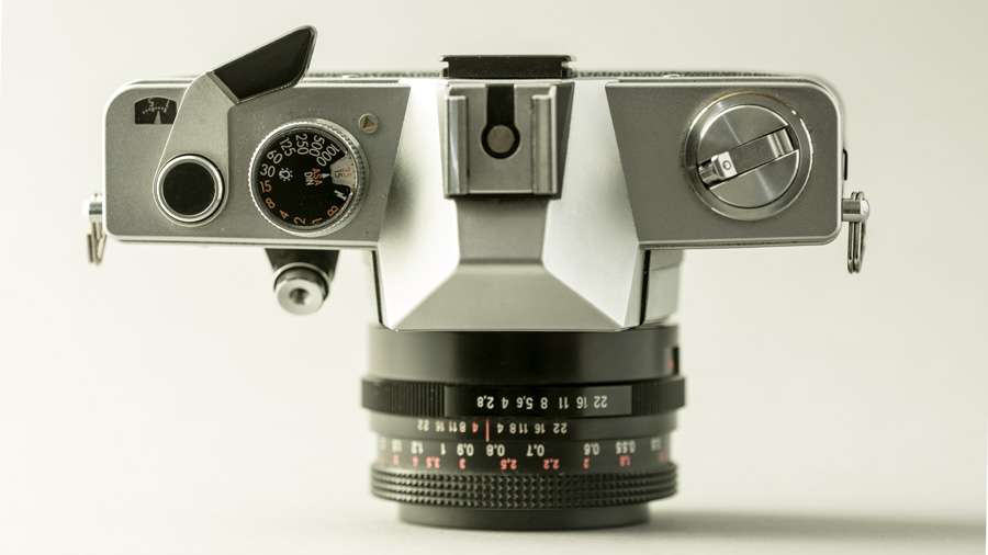 Ausstattung: Filmtransport und Verschlußaufzug mit Schnellschalthebel Automatische Filmeinfädelung in die Aufwickelspule Automatische Rückstellung des Bildzählwerks beim Öffnen der Rückwand Filmmerkscheibe im Verschlußzeitenknopf - 12-33° DIN, 12-1600 ASA Öffnen der Rückwand durch Ziehen des Rückspulknopfes Auslöser verriegelbar Stativgewinde 1/4"