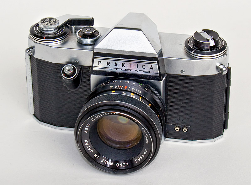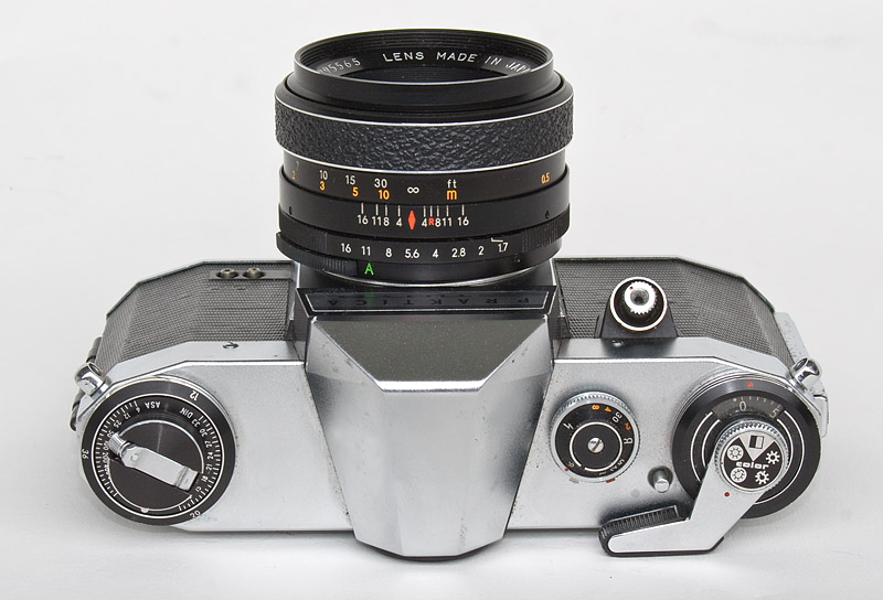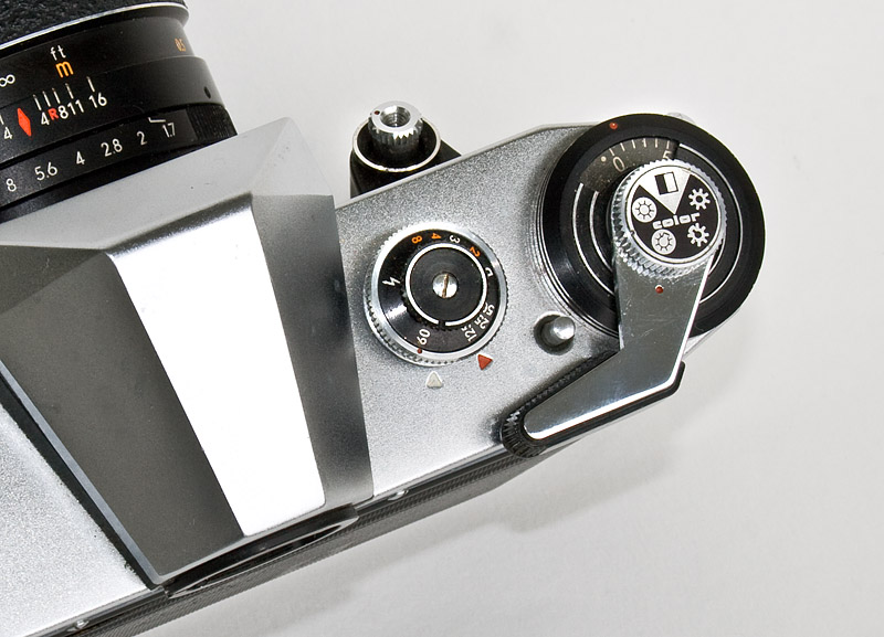 Die erste Praktica mit Belichtungszeiten nach der DIN-Reihe, nur die 1/15 sek fehlt! Der Einstellknopf für die Belichtungszeiten ist zweiteilig ausgeführt. Wird der innere Drehknopf von der weissen auf die rote Dreiecksmarke gedreht wir das Langzeithemmwerk dazugeschaltet. Es gelten dann die drei roten Verschlusszeiten (1/2, 1/4, 1/8 sek.). Der ganze Verschlußzeitenknof dreht sich übrigens beim Filmtransport (und Verschlussspannen) und beim Auslösen mit.