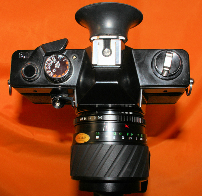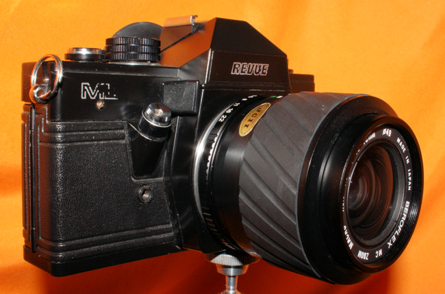 Ich nenne hier mal das Stichwort Praktica MTL 5 so heißt das Modell nämlich wirklich. Quelle hat sie aus der DDR bezogen und unter der Eigenmarke "Revue" verkauft. Zum Set gehörten noch ein Aufsteckblitz und ein Alukoffer. Kam zus. 300 oder 350 DM. Das oben gezeigte Objektiv aus Japan gehörte nicht zu Set, sondern das Normalobjektiv f 1,8/50 mm