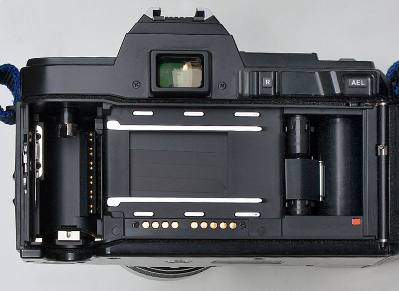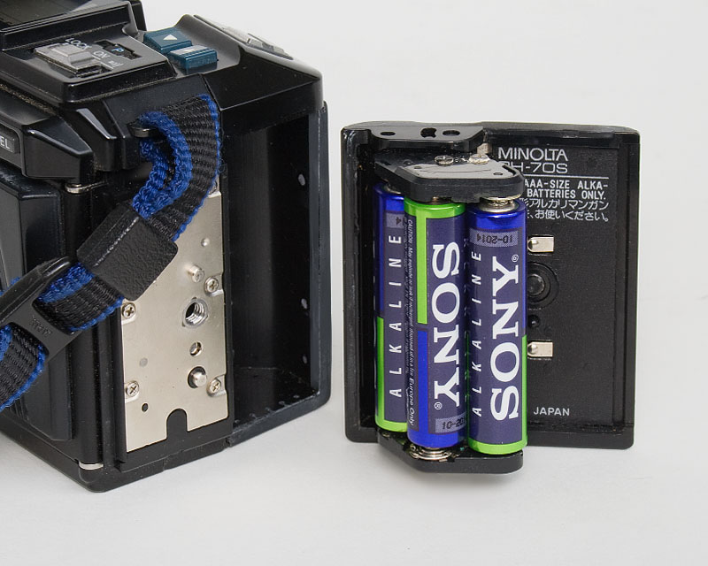 Vier winzige AAA Batterien versorgen das gesamte System! Bei kaltem Wetter ist mitunter schon nach 1 1/2 Filmen Schluss. Speziell während der Filmrückspulung, wenn der Motor viel Strom zieht, schaltet die Kamera plötzlich ohne Vorwarnung ab und ist erst nach dem Einsatz neuer Batterien zur Weiterarbeit zu bewegen.