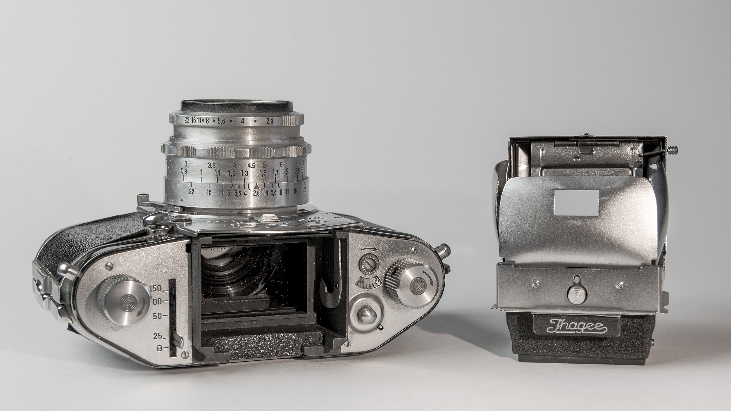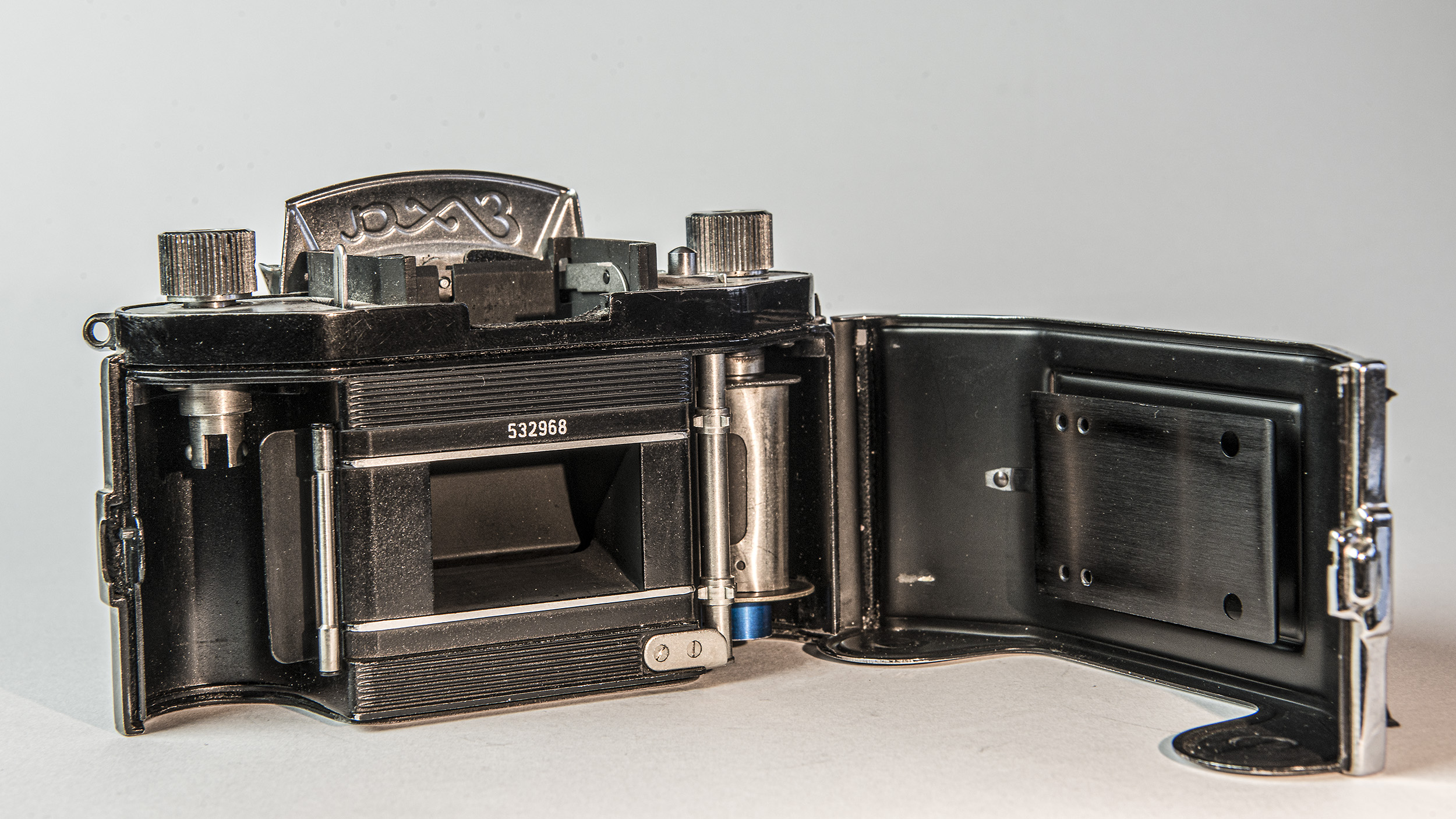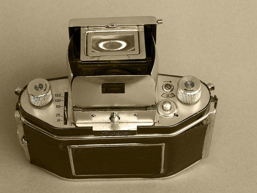 Die "Kleinigkeiten" betreffen einerseits die Änderung des Schriftzuges "EXA" und andererseits die Veränderung am Suchereinsatz. So ist beim älteren Modell noch der sog. Sportsucher aktivierbar, beim neueren Einsatz entfällt dieser und nur die Sucherlupe ist noch verbaut (hier zur besseren Sichtbarkeit ausgeklappt und nicht in Arbeitsstellung). Dafür war der "moderne" Einsatz so standartisiert, das er sogar auf der Jahre später gebaute Exa 2B noch passt.