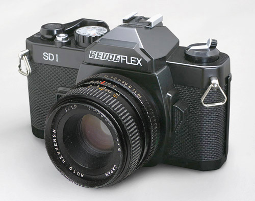 Das Quelle Foto Versandhaus Nürnberg der Familie Schickedanz bot in den Katalogen zahlreiche Fotogeräte namhafter Hersteller unter dem Eigennamen "Revue" an. Die hier vorgestellte Spiegelreflex SD 1 ist bis bis auf kleine Gehäusedetails mit der CS-4 von Chinon baugleich. Bei der Gravur auf dem Objektiv wurde nur "Auto Chinon" auf "Auto Revuenon" geändert.
