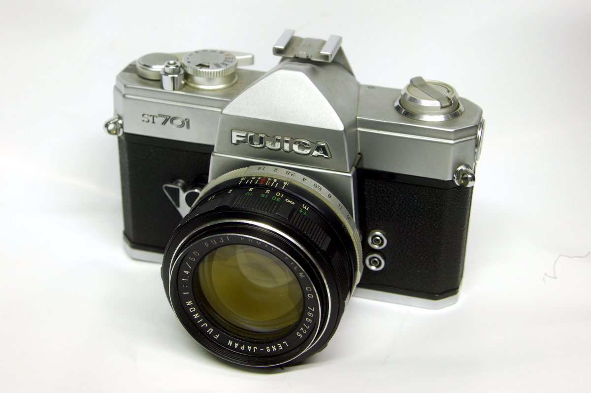 Von der Haptik her gesehen finde ich diese und ihren Nachfiolger (ST801) am "knuffigsten", ähnlich wie die Paxette bei den Sucherkameras. Dabei hat sie einen sehr großen hellen Sucher. Dieses Exemplar scheint die ältere von 2 Versionen zu sein (mit glänzender erhabener Fujica Aufschrift). Das Fujinon läßt sich ohne Probleme sehr gut über Adapter digital nutzen.