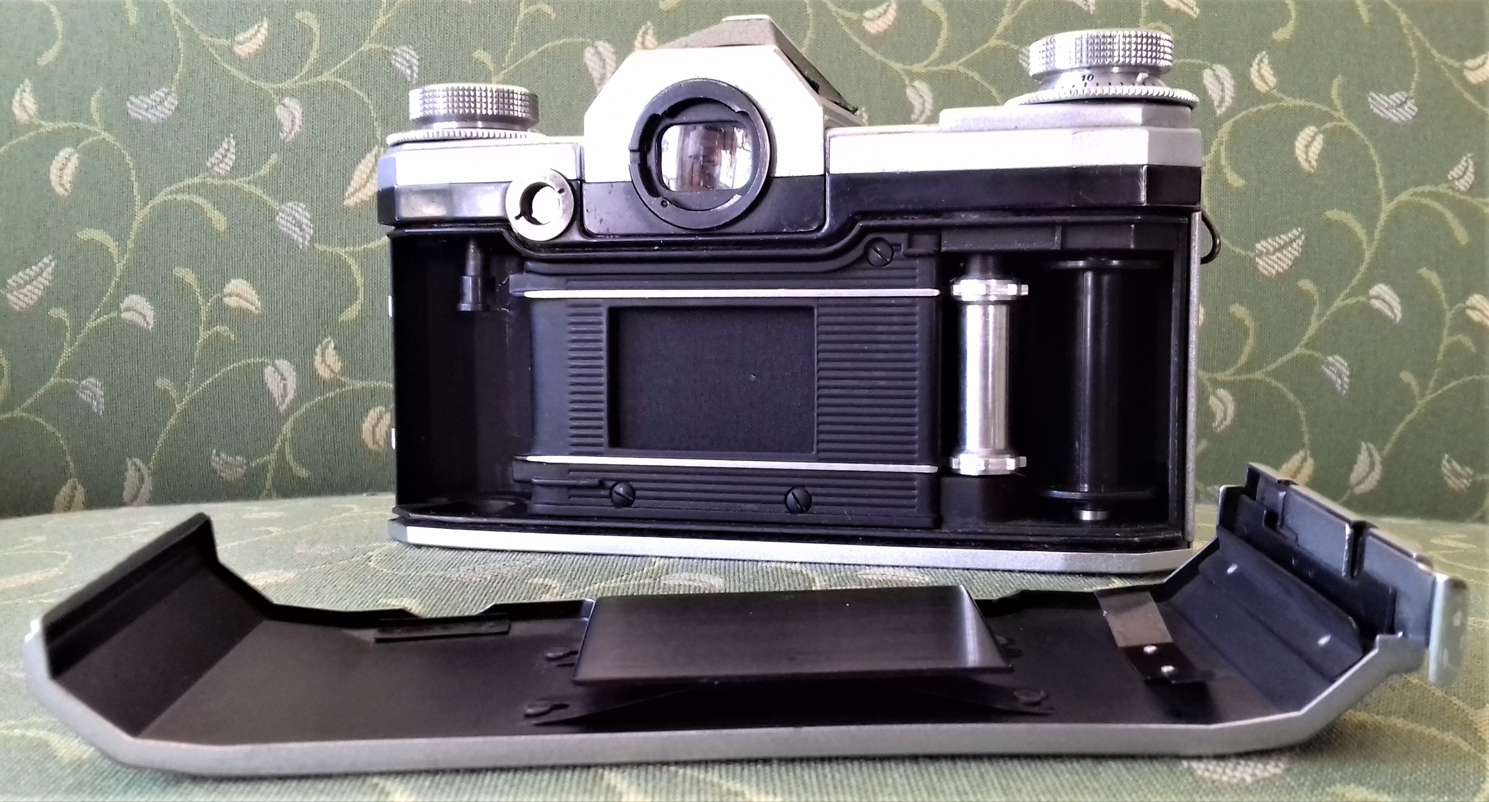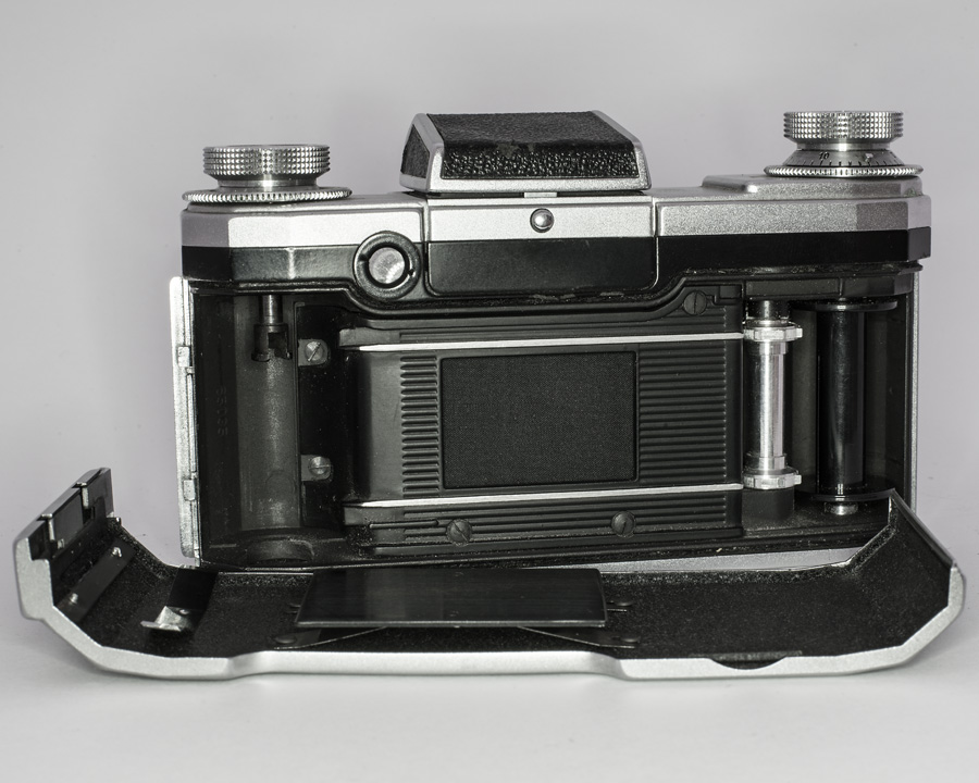 nur zum Vergleich (es gibt ja im Forum schon einen sehr guten Beitrag zur Praktina IIa) hier noch das jüngere Schwestermodell (ca. 1958) mit neuer Zeitenreihe (B, 1, 1/2, 1/4, 1/8, 1/15, 1/30, Blitz, 1/60, 1/125, 1/250, 1/500, 1/1000) und Blendenautomatik für vollautomatische Objektive (hier das seltene sechslinsige Flexon 2/50, Nachfolger des Biotar und Vorgänger des Pancolar). Schwachpunkt bei den über 60 Jahre alten Praktinas ist meiner Erfahrung nach leider oft der defekte Tuchverschluss (Mikrolöcher), der nur schwer zu bessern ist. Hier auch ein Bild vom Innenleben (weil gerade kein Film drin ist ).