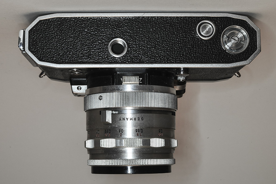 Der Objektivanschluss war ein Bajonett. Das vorhandene Tessar 2,8/50mm hat eine Blendenhalbautomatik , d.h. die vorgewählte Arbeitsblende konnte mit einem Schieber an der Unterseite des Objektivs geöffnet werden und ermöglichte so ein helles Sucherbild bis zur Auslösung. Das FX steht auch hier wieder für die beiden Blitzbuchsen mit X- und F-Synchronisation.