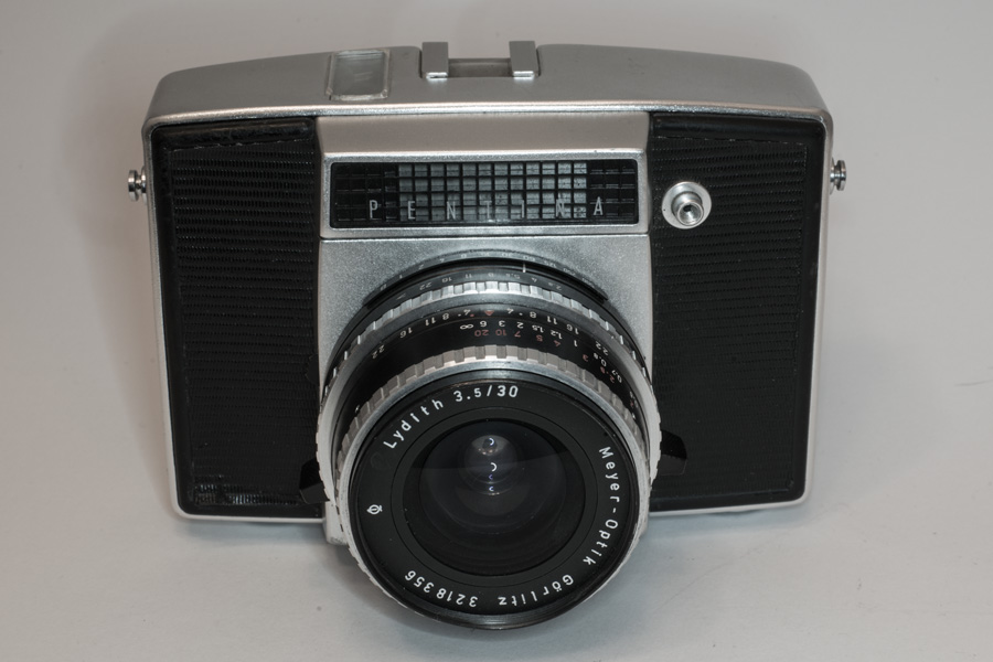 Hersteller: Pentacon ? Modell: Pentina Baujahr: ? einäugige Spiegelreflexkamera 24x36 mm mit fest eingebautem Prismensucher Wechselobjektive mit Pentina-Steckbajonett: Meyer Lydith 1:3,5/30 mm an diesem Modell Auch ein Carl Zeiss Jena Tessar 1:2,8/50 mm, Carl Zeiss Jena Cardinar 1:2,8/85 mm und ein Meyer Domigor 1:4/135 mm waren im Angebot für diese Kamera Blendenautomatik bei allen Objektiven vorhanden Selen-Belichtungsmesser mit Nachführzeiger an diesem Modell Schnellaufzug mit Filmtransport und Verschluss gekuppelt Prestor-00-Reflex-Zentralverschluss mit Belichtungszeiten von 1 s bis 1/500 s und B Blitzsynchronisierung M oder X, umschaltbar, kürzeste Elektronenblitzzeiten realisierbar Bei späteren Varianten Bildfeldlinse auch mit Messkeil oder als Fresnellinse mit Messkeil Bildzählwerk, Vorlaufwerk, Rückspulkurbel, Zubehörsteckschuh, Trageösen, Filmmerkscheibe Anschluss für Okularzubehör (wie Augenmuschel, Einstellfernrohr, Winkelsucher); Stativanschluss ¼“ Filmempfindlichkeitseinstellung 9°-33°DIN bzw. 6-1600 ASA Bodymaße: Länge: 132 mm Breite: 54mm( ohne Objektiv) Höhe: 95mm Gewicht mit Objektiv Meyer Lydith 3,5/35mm : 818 g