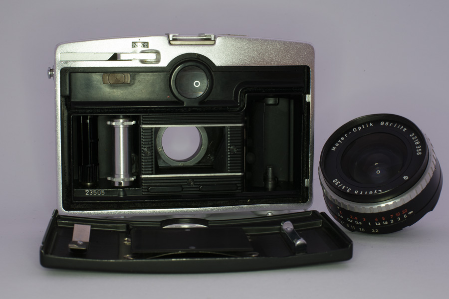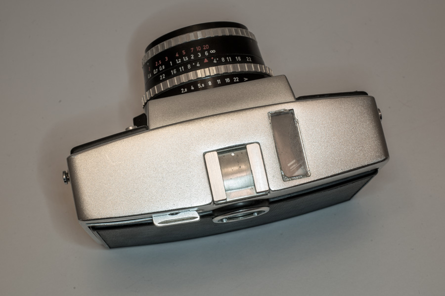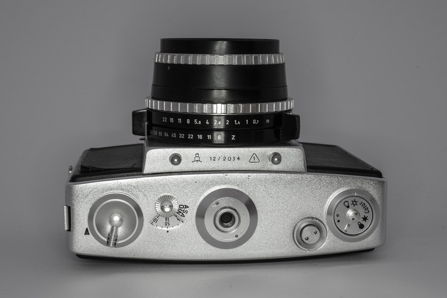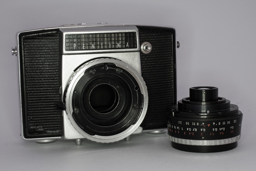 Pentina Auf den ersten Blick nicht als Spiegelreflexkamera zu erkennen . das charakteristische Pentaprisma wurde in das Gehäuse integriert. Eine weitere Besonderheit war der Zentralverschluss. (funktioniert bei meinem Modell leider nicht mehr). Deutlich erkennbar die Selen-Zelle des eingebauten Belichtungsmessers.