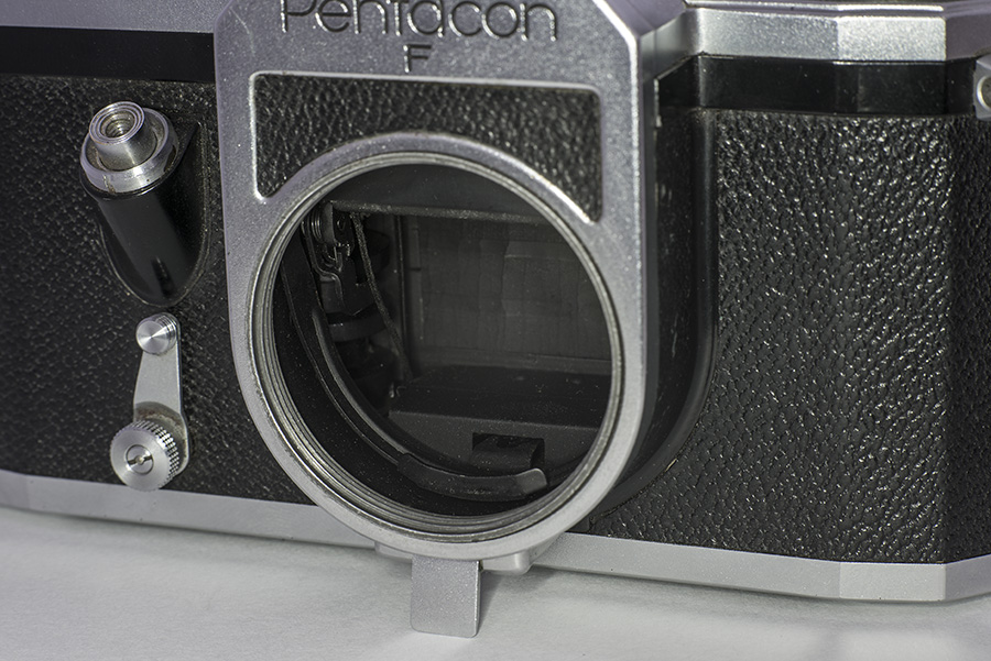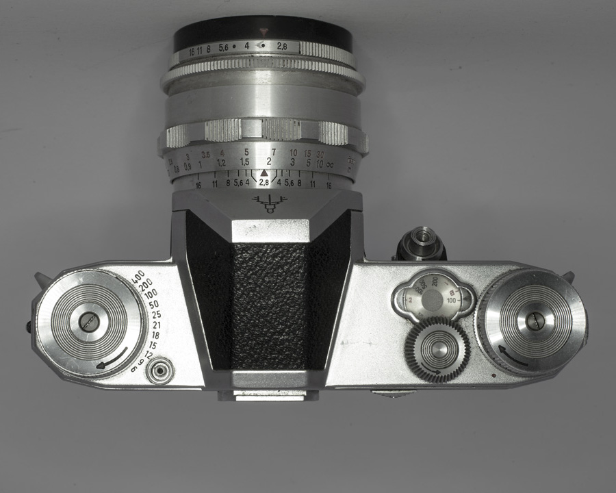 Besonderheiten: Erstmals gibt es eine Bildfeldlinse unterhalb des Prismas sowie einen Bügel für die Blendeninnenauslösung entsprechender Objektivtypen. Das funktionierte aber nicht mit dem hier gezeigten Biotar 2/58 mm von Carl Zeiss Jena. Die Kamera ist "vitrinenfreundlich" - die ausklappbare Lasche unter dem Spiegelkasten ermöglicht eine hervorragende Standfestigkeit auch mit Objektiv (Dreipunktlagerung).