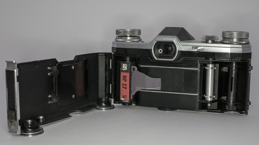 Die Rückwand ist angelenkt. Ein Blitzkontaktbuchse mit X-Synchronisation ist oben neben dem Rückspulknopf vorhanden. Das Pentaprisma ist fest eingebaut. Negativformat 24x36mm in Kleinbildpatrone 135 mit 36 Aufnahmen
