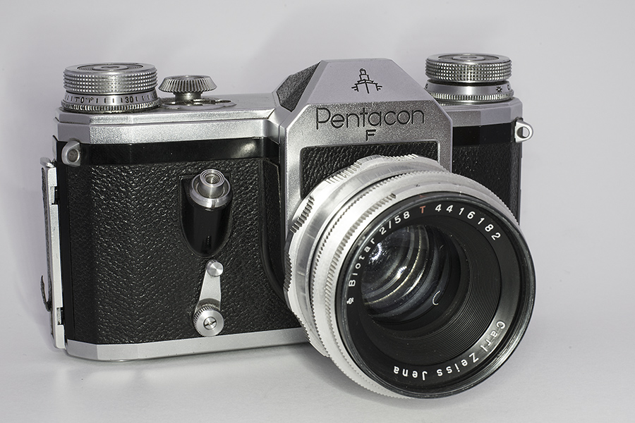 Baugleich mit der Contax F wurde die Pentacon F ab Ende 1956 als das letzte Modell der Spiegelcontax-Reihe bis 1961 in ca. 33900 Stück von den Zeiss-Ikon Werken in Dresden gebaut. Der Objektivanschluß erfolgt über ein M 42 –Gewinde.