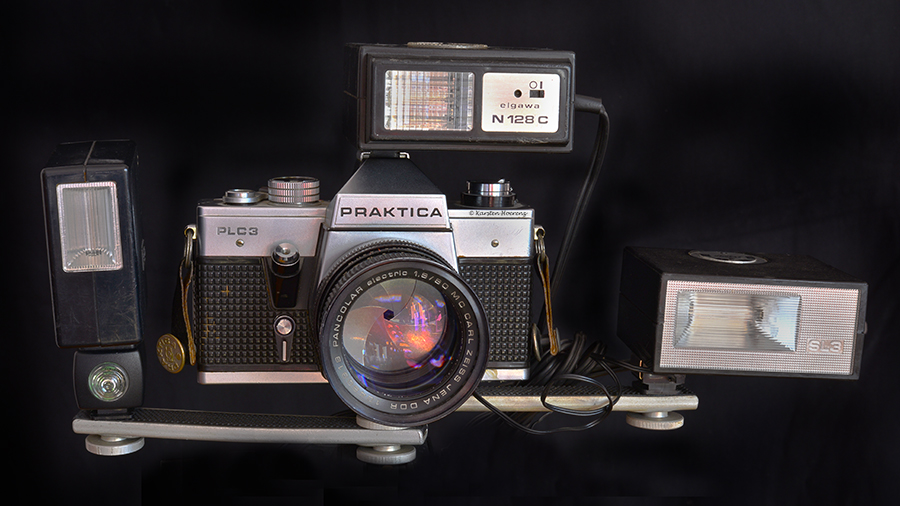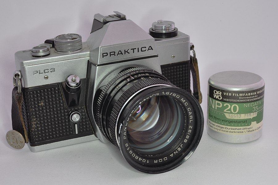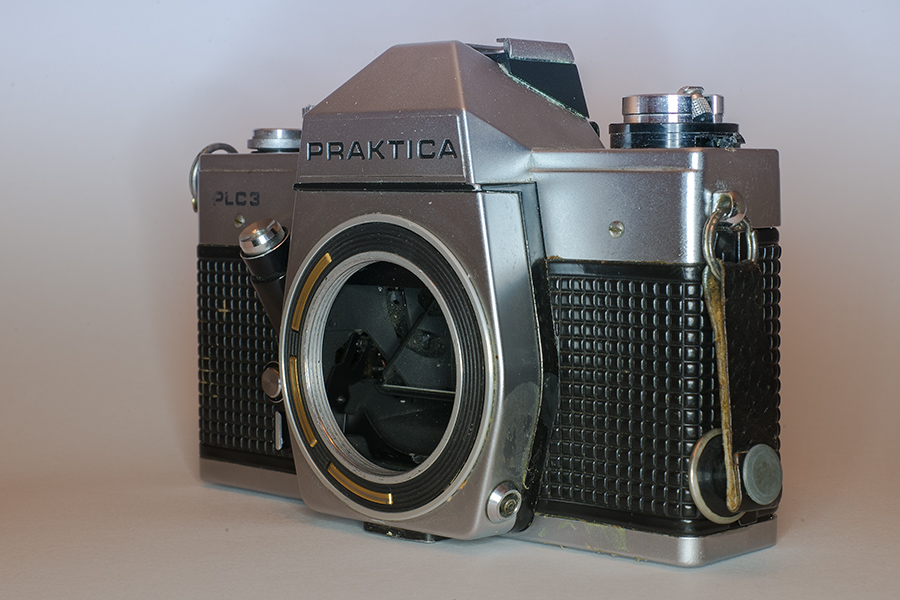 Die PLC 3, eine KAmera aus der 3. Generation der Praktica L-Reihe. Technisch entspricht die PLC 3 den Grundwerten dieser Reihe, bei der das L für den Einsatz des Metalllamellenverschlusses steht. Ansonsten entspricht sie der nahezu baugleichen VLC 2 bzw. VLC 3. Im Unterschied zur VLC läßt sich aber das Suchersystem nicht wechseln. Dafür wurde der PLC eine zweite Anschlussbuchse für den Blitz spendiert, so das man mit der Kamera mehrere Blitzgeräte steuern konnte. Einmal über den Blitzschuh oben auf dem Prisma und einmal über den Kabelanschluß unten links am Gehäuse. Eine Kamera, mit der ich von 1978 bis 1993 fotografiert habe.