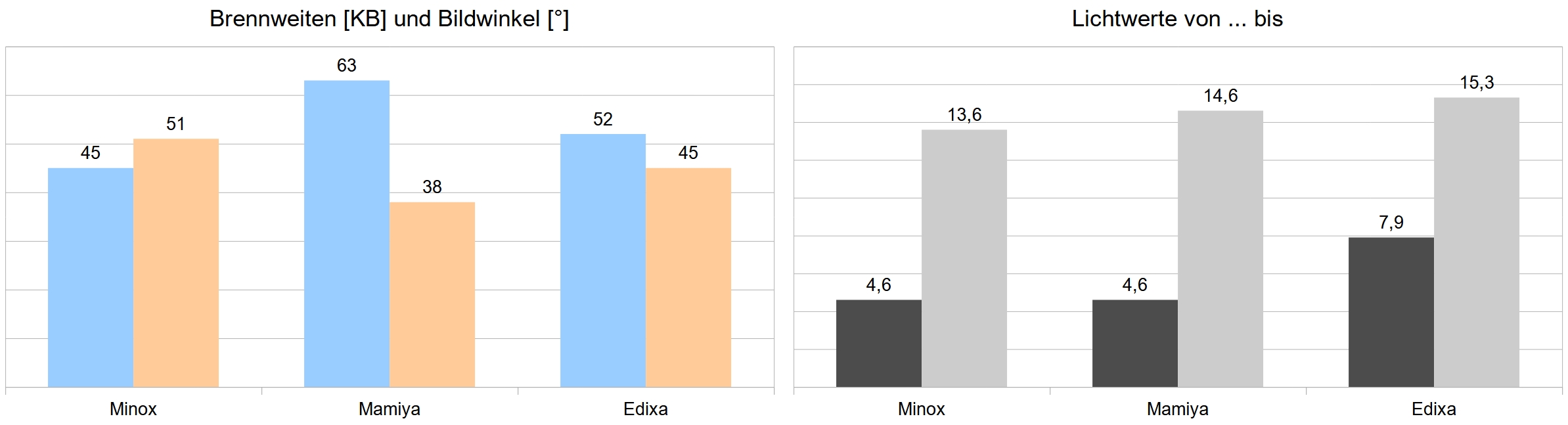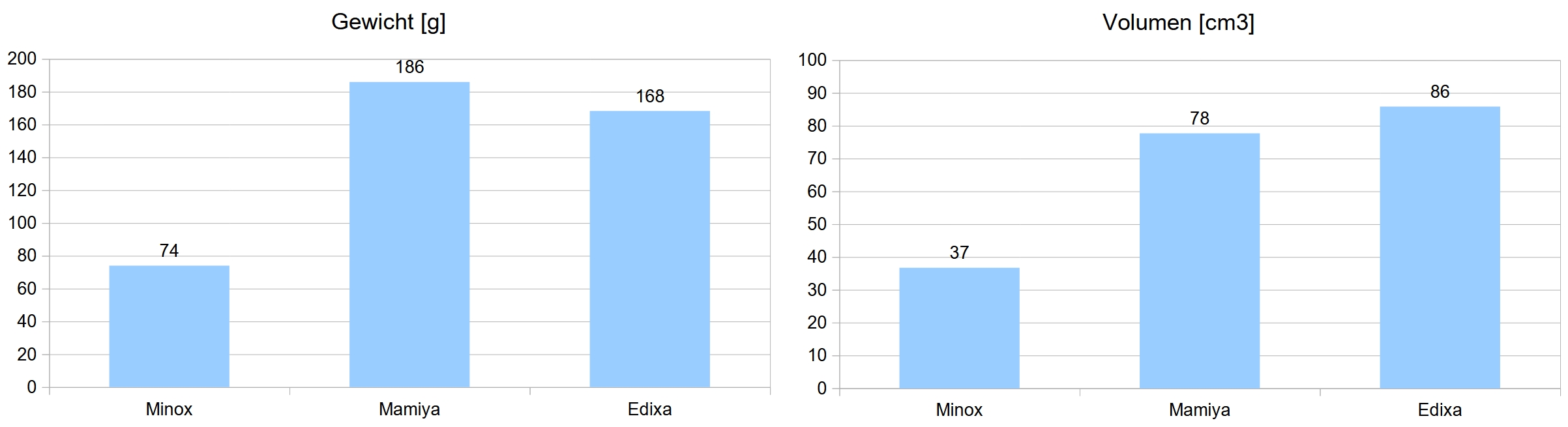 TransportAlle drei Kameras können in speziellen Taschen transportiert werden und sind dann gut geschützt. Bei der Edixa ist das auch notwendig, da Sucher und Objektiv sonst völlig ungeschützt sind, nur der Auslöser kann arretiert werden. Die beiden anderen Kameras können dagegen problemlos ohne Tasche mitgenommen werden, da sie entsprechende Schutzfunktionen eingebaut haben.