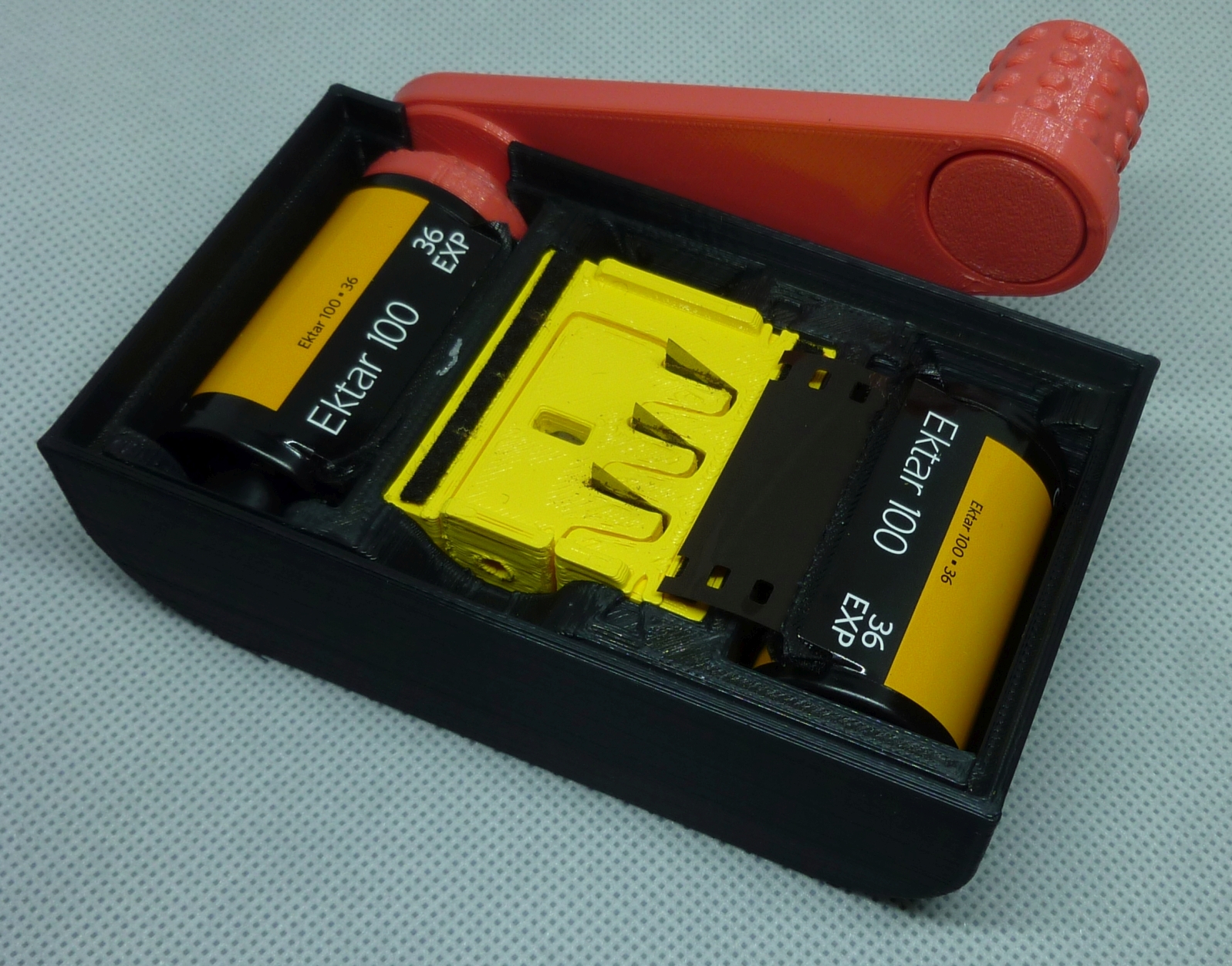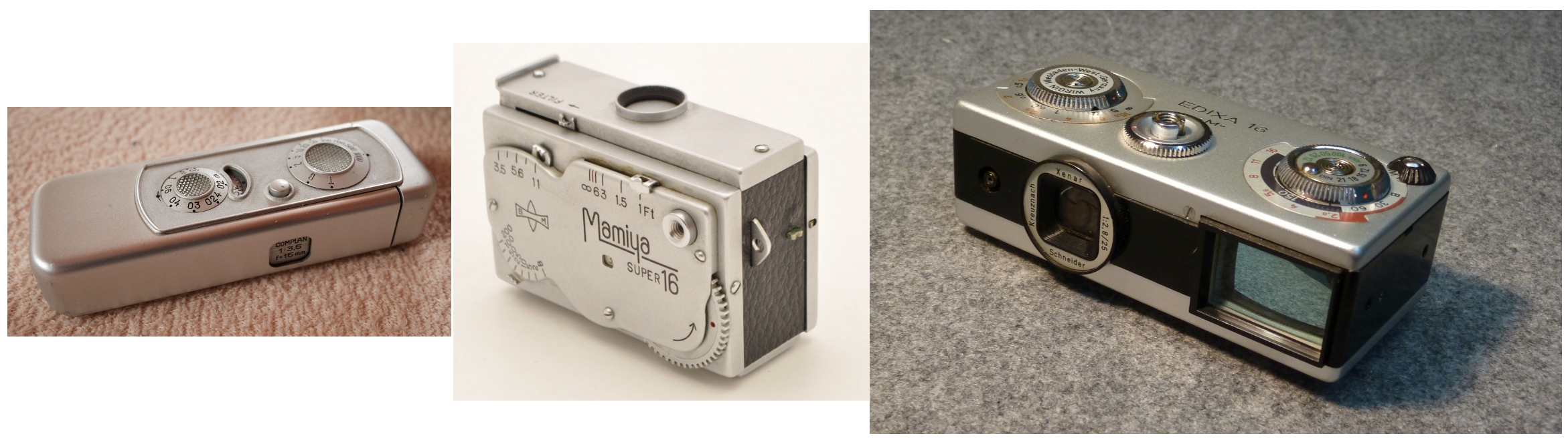 Minox. Man öffnet die Rückwand und legt die Doppelpatrone in das Fach ein. Hier muss man man lediglich darauf achten, dass die Filmandruckplatte gelöst ist, sonst ist weder das Einlegen noch das Herausnehmen der Patrone möglich. Vor dem Einlegen muss man außerdem unbedingt das Bildzählwerk richtig einstellen. Die Minox wertet nämlich die Bildnummer aus, um den Abstand der Negative auf dem Film gleichmäßig zu halten.