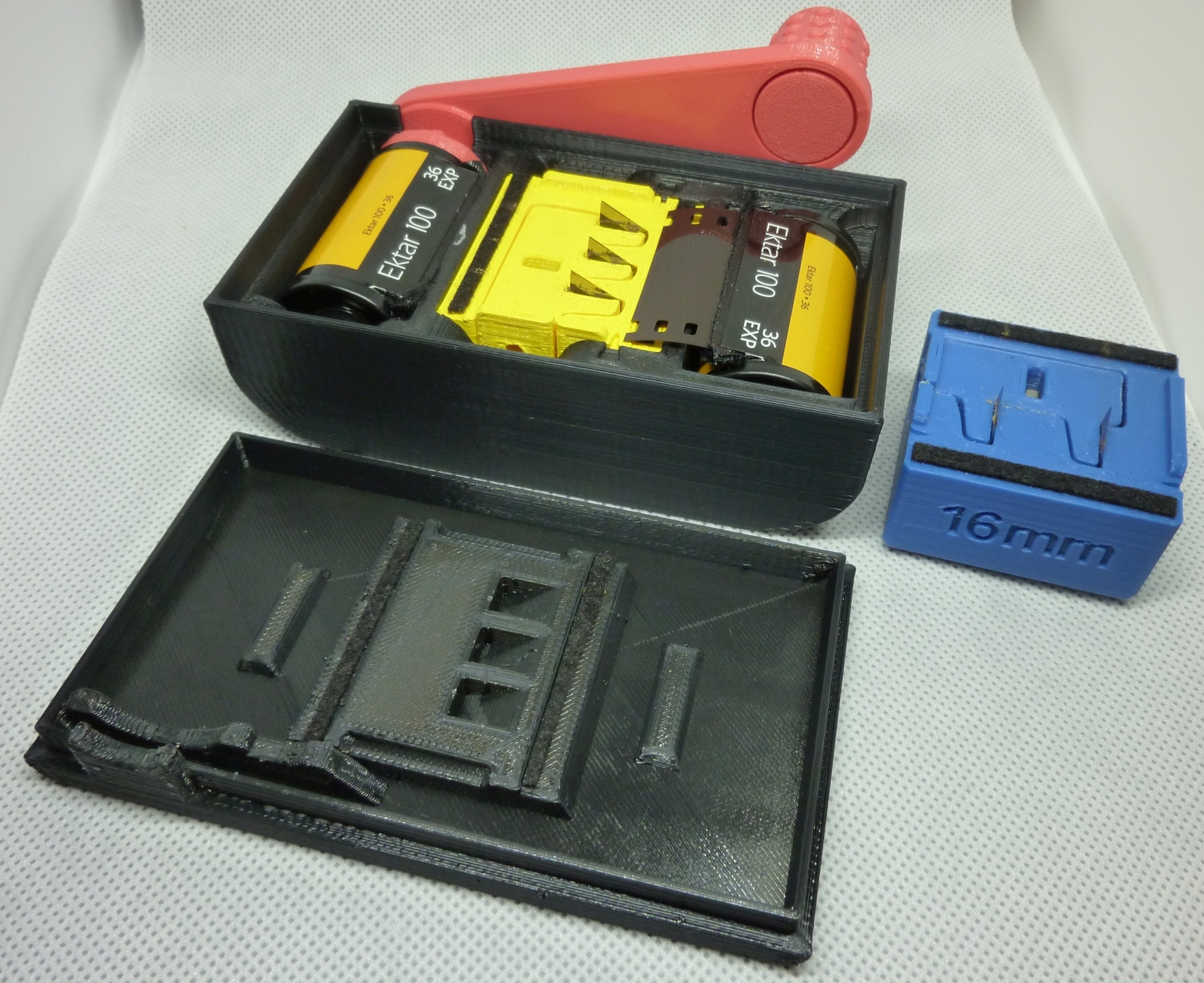 Mamiya kann ebenfalls mit fertigen Doppelpatronen bestückt werden. Diese muss dann nur in die geöffnete Kamera eingelegt und diese wieder verschlossen werden. Alternativ kann man zwei mitgelieferte Metall-Einzelpatronen verwenden, die man vorher selber mit unperforiertem 16 mm Film bestückt hat. Das geht sehr leicht.