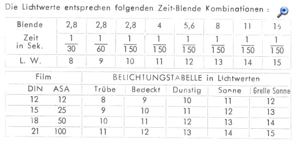 Verschluss: B, 1/30 (bei umgelegten Blitzhebel) sonst Lichtwertsteuerung, intern noch 1/60 und 1/150 Sek.