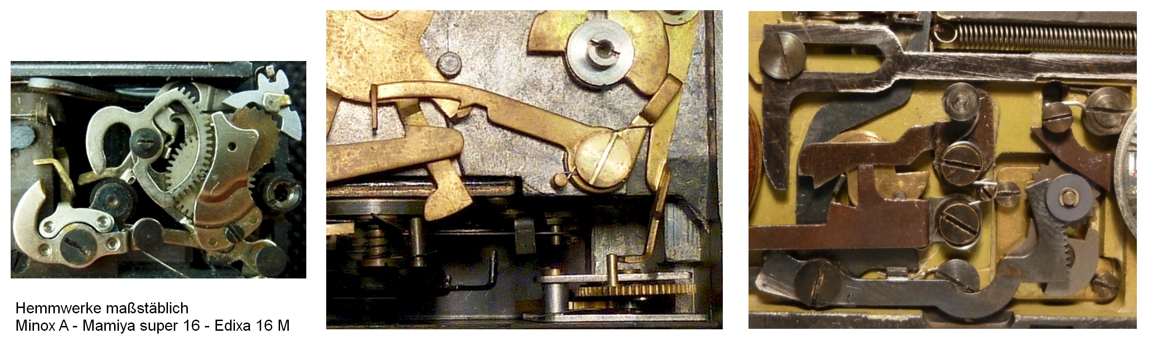 Seiichi Mamiya - Der Pragmatiker orientiert sich am Machbaren und findet genial einfache Lösungen, die zu einer bedienungsfreundlichen und robusten Konstruktion führen. Er ist der Meister des 80/20 Prinzips, indem er hohe Qualität anstrebt, aber bereit ist Kompromisse zu machen. Er treibt z. B. die Miniaturisierung nicht auf die Spitze, sondern entscheidet sich für eine einfache Konstruktion, die dafür extrem robust und wartungsfreundlich ist. Schaut man genau hin, so findet man überall originelle und genau durchdachte kleinste Details, wie z. B. die Anordnung der 3(!) Gehäuseschrauben auf der Unterseite, mit denen diese die Kamera auf jeder Oberfläche steht ohne zu wackeln. Heinz Waaske - Der Technikbegeisterte lässt vermuten, dass er großen Spaß hatte am Lösen von technischen Problemen. Obwohl er viele - darunter sehr erfolgreiche - Kameramodelle entwickelt hat, hat er selbst nicht besonders gerne fotografiert. Er lebte sich wohl eher in seiner technisch-feinmechanischen Welt aus und und suchte dort seine Erfolgserlebnisse. Dies führte vielleicht zu dem anspruchsvollen, fast verwirrenden Bedienkonzept dieser Kamera, während ihre Technik über jeden Zweifel erhaben ist. Die Umsetzung Ein Blick ins Innere der Kameras ist aufschlussreich. Hier die Verschlusssteuerungen: