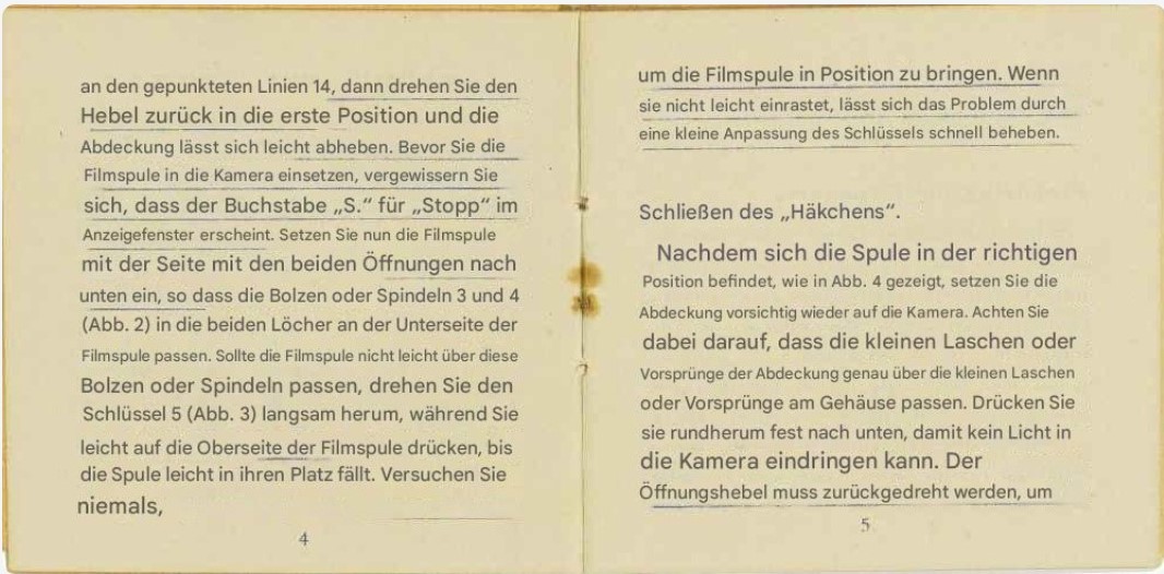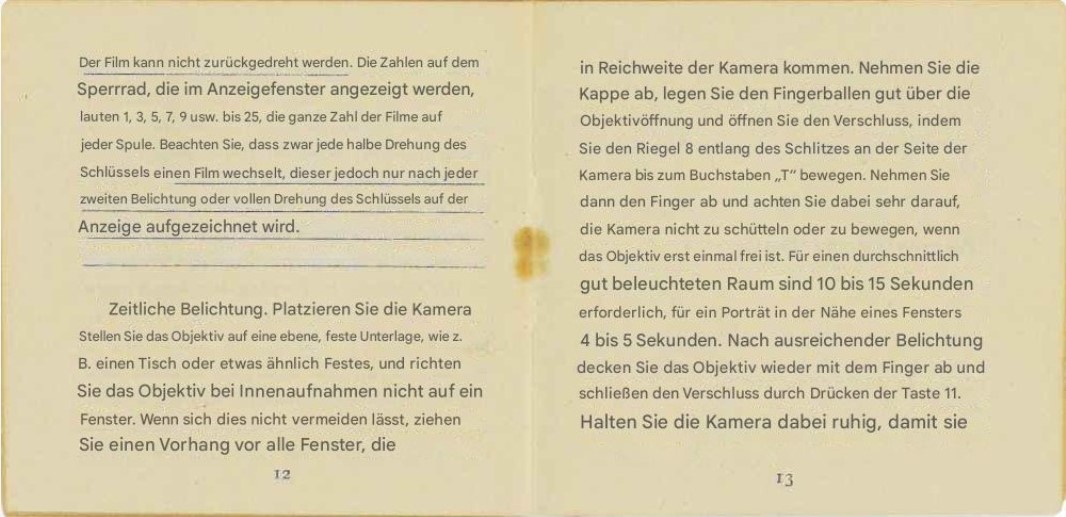 einen Fehler habe ich bei meiner Filmfummelei leider eingebaut. Das ist mir aber erst aufgefallen, als ich die Spule in die Kamera eingesetzt habe. Aufgrund der Patronenkonstruktion hätte der Film gegenläufig aufgespult werden müssen, denn die auf der Spule außenliegende Filmseite wird belichtet. Ich habe den Film einfach in der vorhandenen Rollrichtung aufgespult, wie ich das korrekterweise auch beim Befüllen der Minox-Patrone gehandhabt habe. Grundsätzlich dieser Fehler nicht so schwerwiegend, da einfach durch das Trägermaterial durchbelichtet werden kann. Im vorliegenden Fall bedeutet es aber auch, dass die Emulsionsseite des Films bei jedem Filmtransport über die nicht wirklich glatte ‚Bildbühne‘ (Patronenaußenseite) geschabt wird.