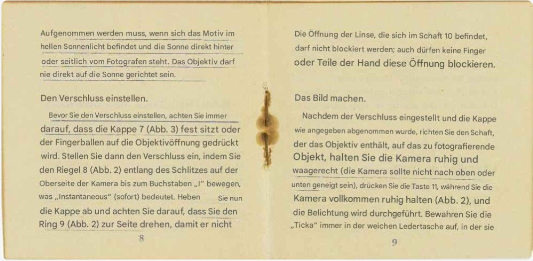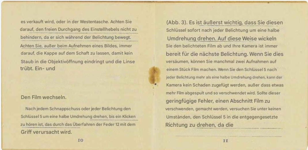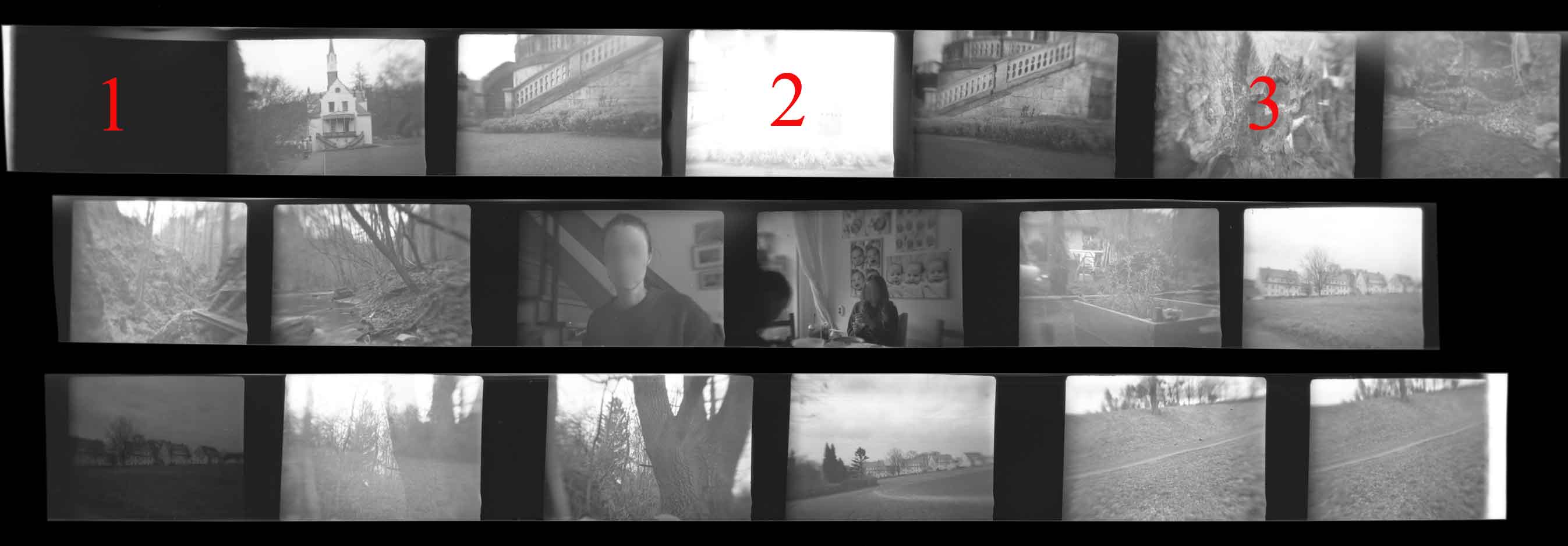 Es passen 19 Bilder auf 51 cm Film. Drei mehr oder weniger typische Belichtungsfehler habe ich mit Zahlen markiert. Bei Nummer „1“ ist der Filmanfang, aber das Bild ist unbelichtet. Das liegt daran, dass ich nach dem Einlegen des Films gemäß der Bedienungsanleitung den Spulknopf um acht halbe Umdrehungen gedreht habe, damit auf dem Filmzähler die Bildnummer 1 erscheint. Dabei wurde dieses Filmstück zu weit vorgespult. Bei Nummer „2“ wurde der Film überbelichtet, da ich den Verschluss nicht korrekt betätigt habe. Aufgrund des weiter oben erläuterten Verschlussproblems, funktioniert die Momentaufnahme nur, wenn man mit einer Hand den Auslöser betätigt und mit der anderen Hand dem Spannhebel einen Schubser gibt. Ich habe vergessen den Auslöser zu drücken und der Verschluss blieb folgerichtig nach dem Schubser auf der T-Stellung hängen – deshalb die Überbelichtung. Bei Nummer „3“ wurde vergessen aufs nächste Bild vorzuspulen, deshalb wurde das Bild doppelt belichtet. Ansonsten gibt es die üblichen Verwacklungen und Belichtungsunterschiede.