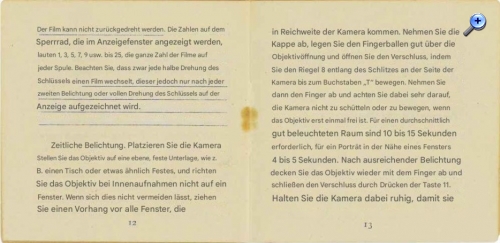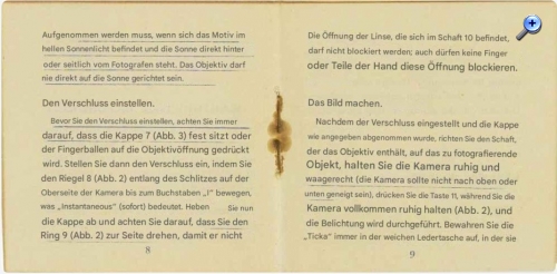 Der Verschluss verfügt über eine „T“- und eine „I“-Stellung. „T“ ist für Langzeitaufnahmen (der Verschluss ist in der „T“-Stellung geöffnet und wird durch drücken des Auslösers geschlossen). „I“ ermöglicht eine Momentzeit von 1/25 s. (Die innere Abdeckplatte ist auf dem obigen Bild schon etwas herausgezogen.)