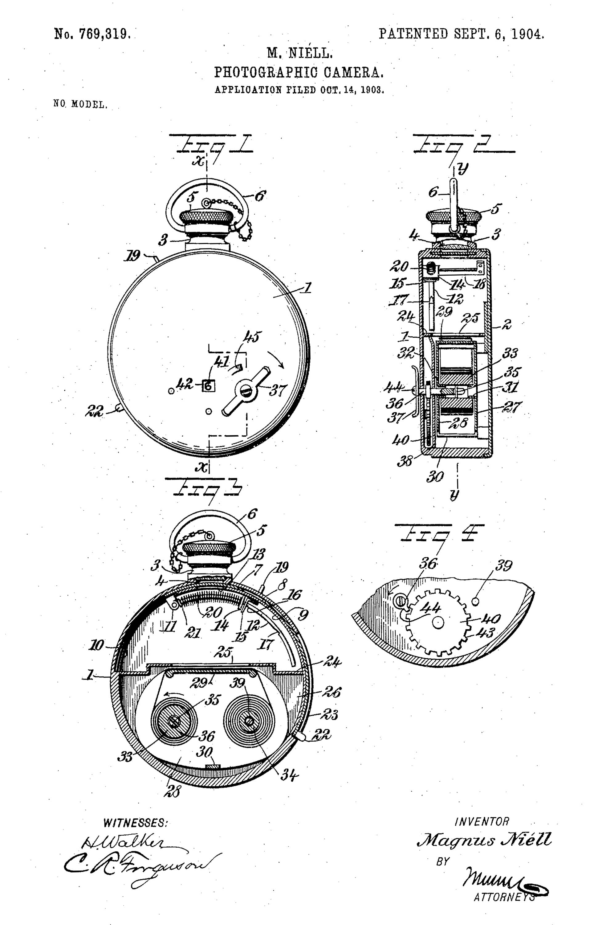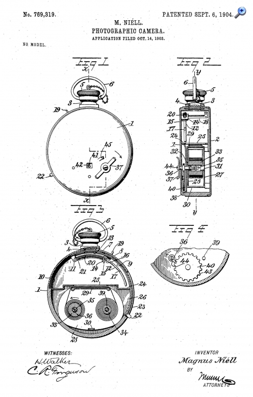 Die Kamera in Taschenuhrform von Magnus Niell wurde ab 1905 bis 1935 in den USA von Expo Camera Co., New York als „Expo Watch“ hergestellt/vermarktet und ebenfalls ab 1905 allerdings nur bis 1914 in Europa von der Houghtons Ltd., London als „Ticka“ hergestellt/vermarktet.