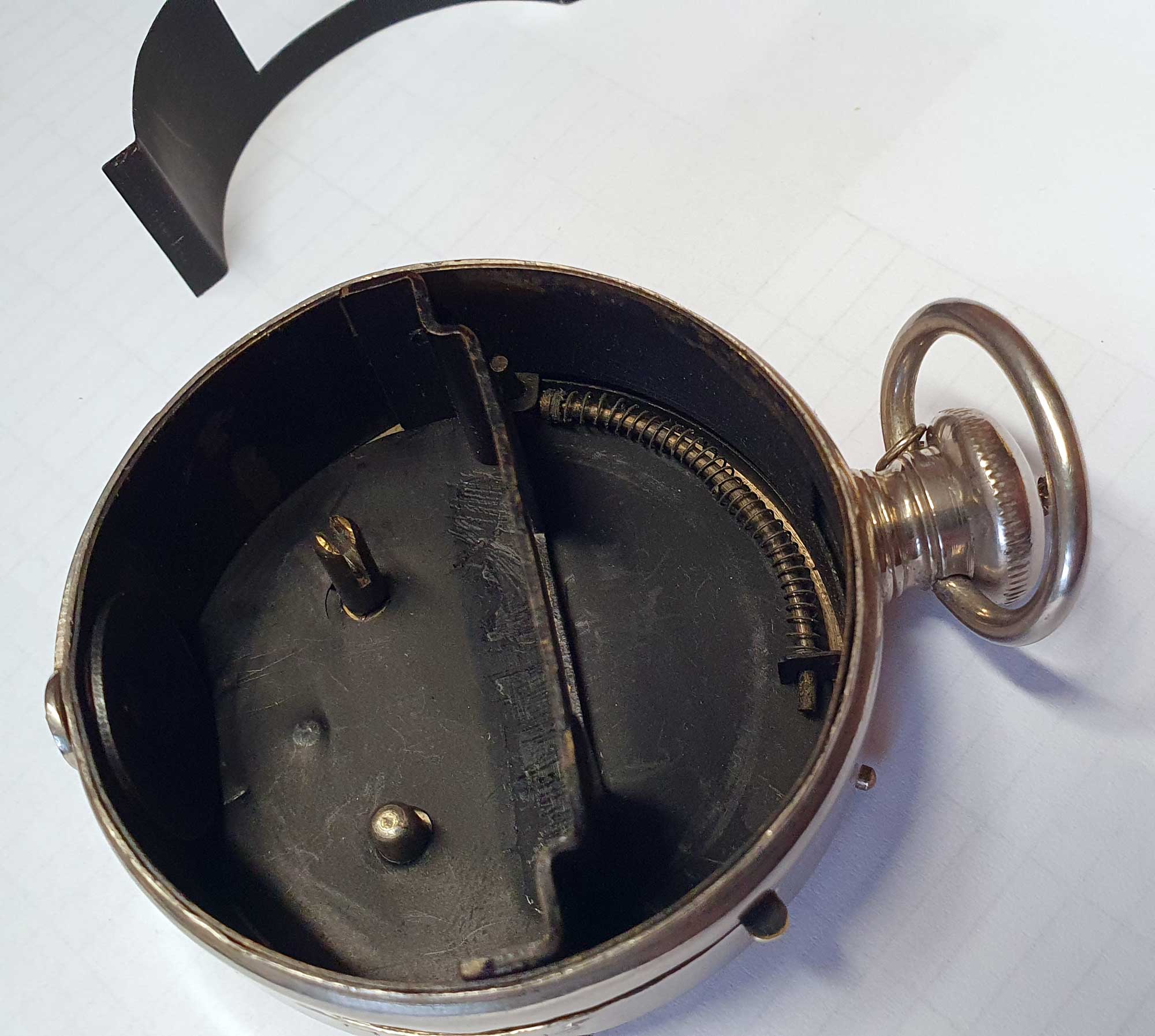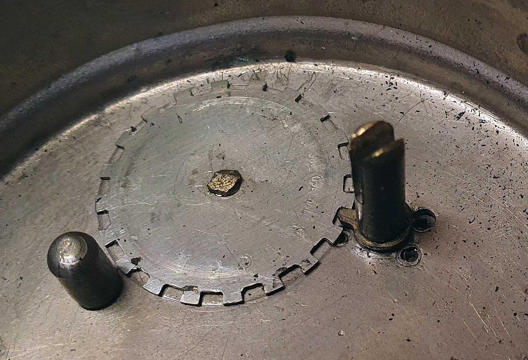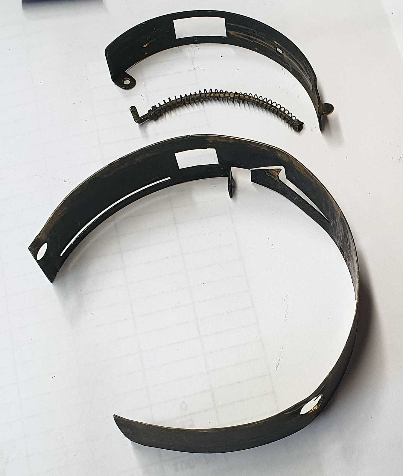 Hier nun die Verschlusslamelle mit der Feder und der Abdeckplatte. Ich denke der einfache Mechanismus ist ganz gut zu erkennen. Das Problem ist beim vorliegenden Exemplar, dass die Verschlusslamelle im gespannten Zustand zu stark an der Kamerawand und der Innenwand reibt und dass die nicht mehr ganz frische Feder zu wenig Kraft aufbringt, um die Lamelle zu bewegen. Nach der Reinigung läuft die „T“-Funktion tadellos, aber in der „I“-Stellung braucht der Spannhebel noch einen Schubser, um die Lamelle in Bewegung zu setzen. Für die Testaufnahmen sollte das aber so gehen.