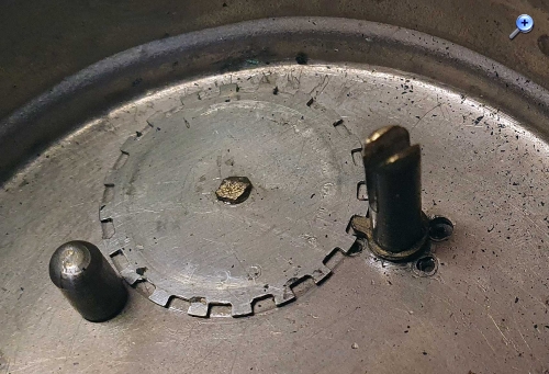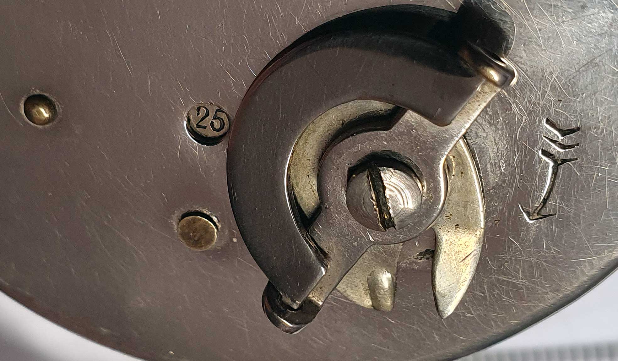 Habe mir die Kamera jetzt auch mal genauer angeschaut. Im obigen Bild ist die Filmspule, die Abdeckung und die Bildmaske entfernt. Man sieht die Feder zum Spannen des Guillotine-Verschlusses. Die Verschlusslamelle befindet sich zwischen der Kamerawandung und einer innenliegenden Abdeckplatte (im Patent Nr. 9). Außerdem sieht man den Hebel zum Spannen des Verschlusses (im Patent Nr. 22) und den Auslöser (Nr. 19).