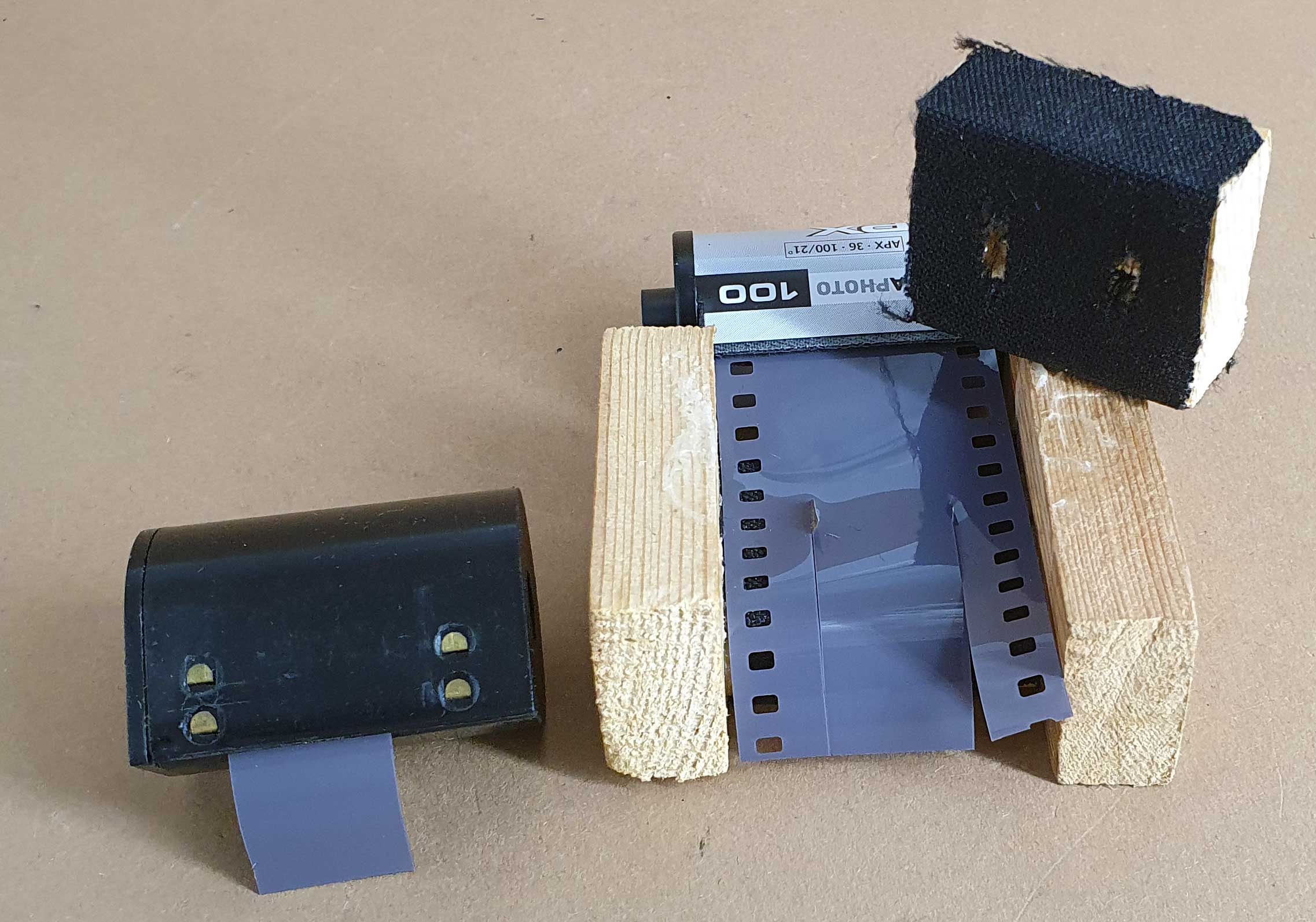 da die Kamera nun einsatzbereit scheint, fehlt noch der Film. Eigentlich hatte ich geplant, einen handelsüblichen Pocketfilm zu verwenden. Wegen der störenden Perforation habe ich nun aber beschlossen, einen passenden Film selbst zu schneiden. Also wurde zunächst ein primitiver Filmschneider gebastelt: