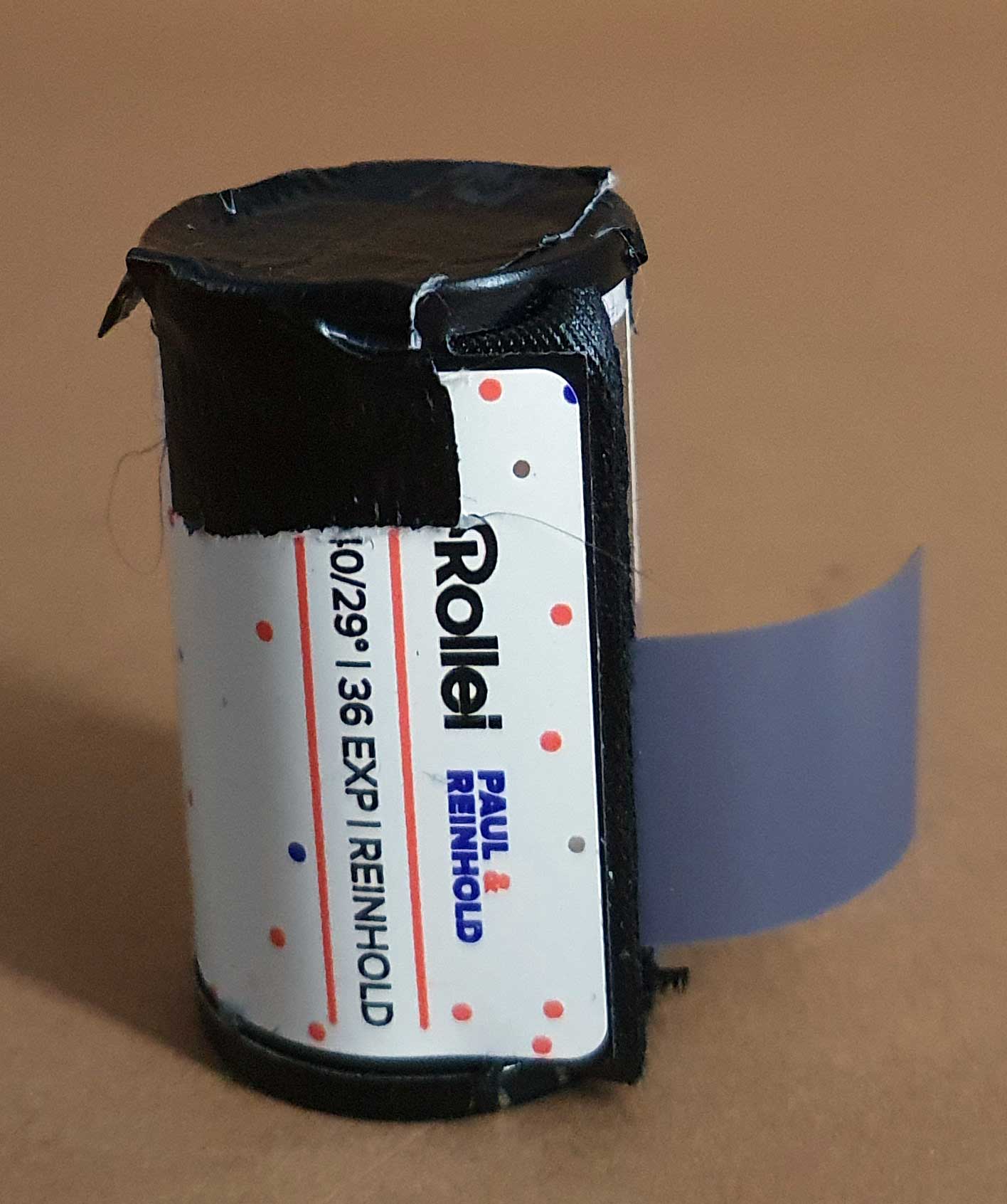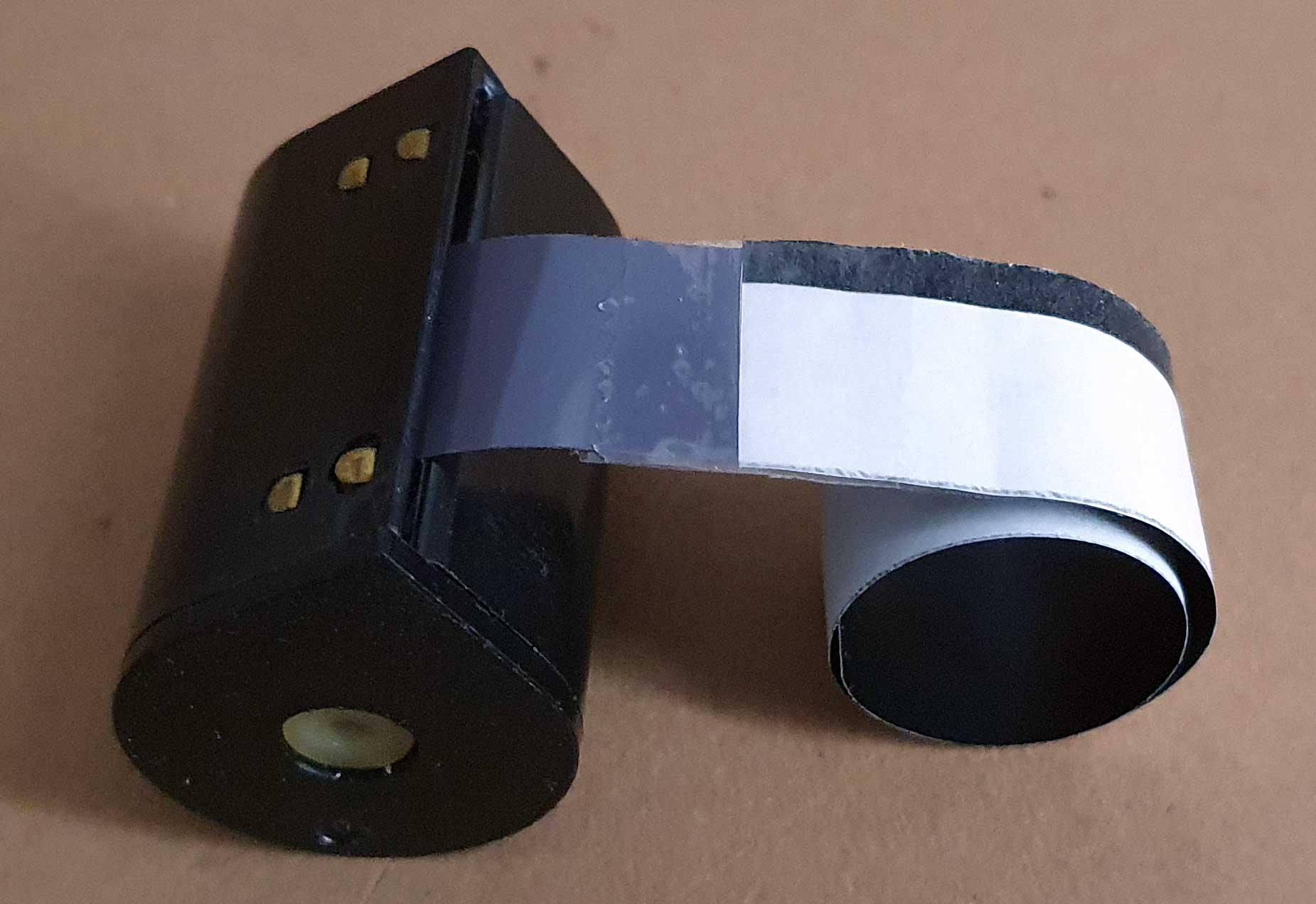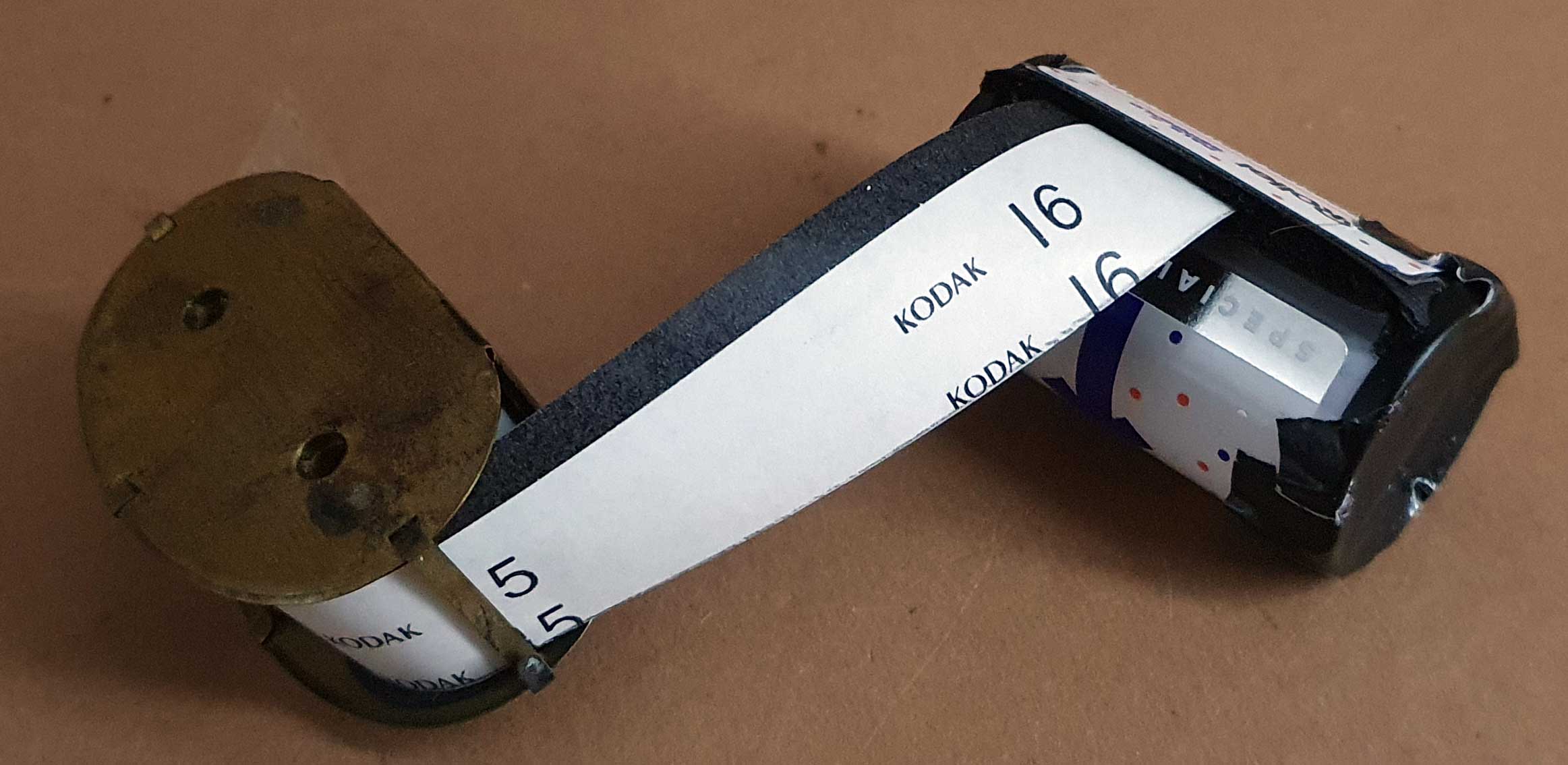 Da sich das Schutzpapier schlecht in die SL-Patrone stecken lässt, wurde der Film anschließend in eine vorbereitete normale KB-Patrone ohne Spulenkern verbracht: