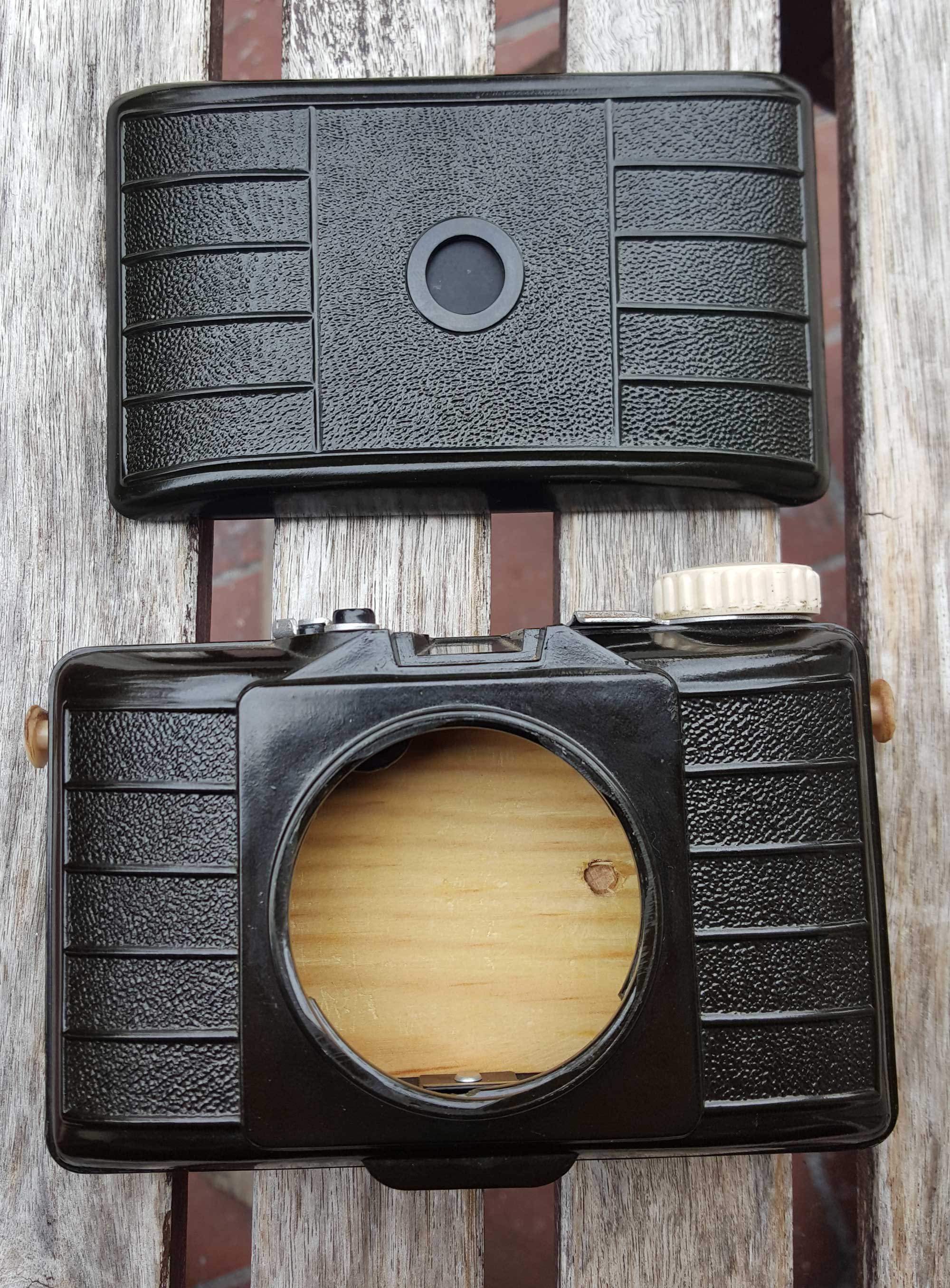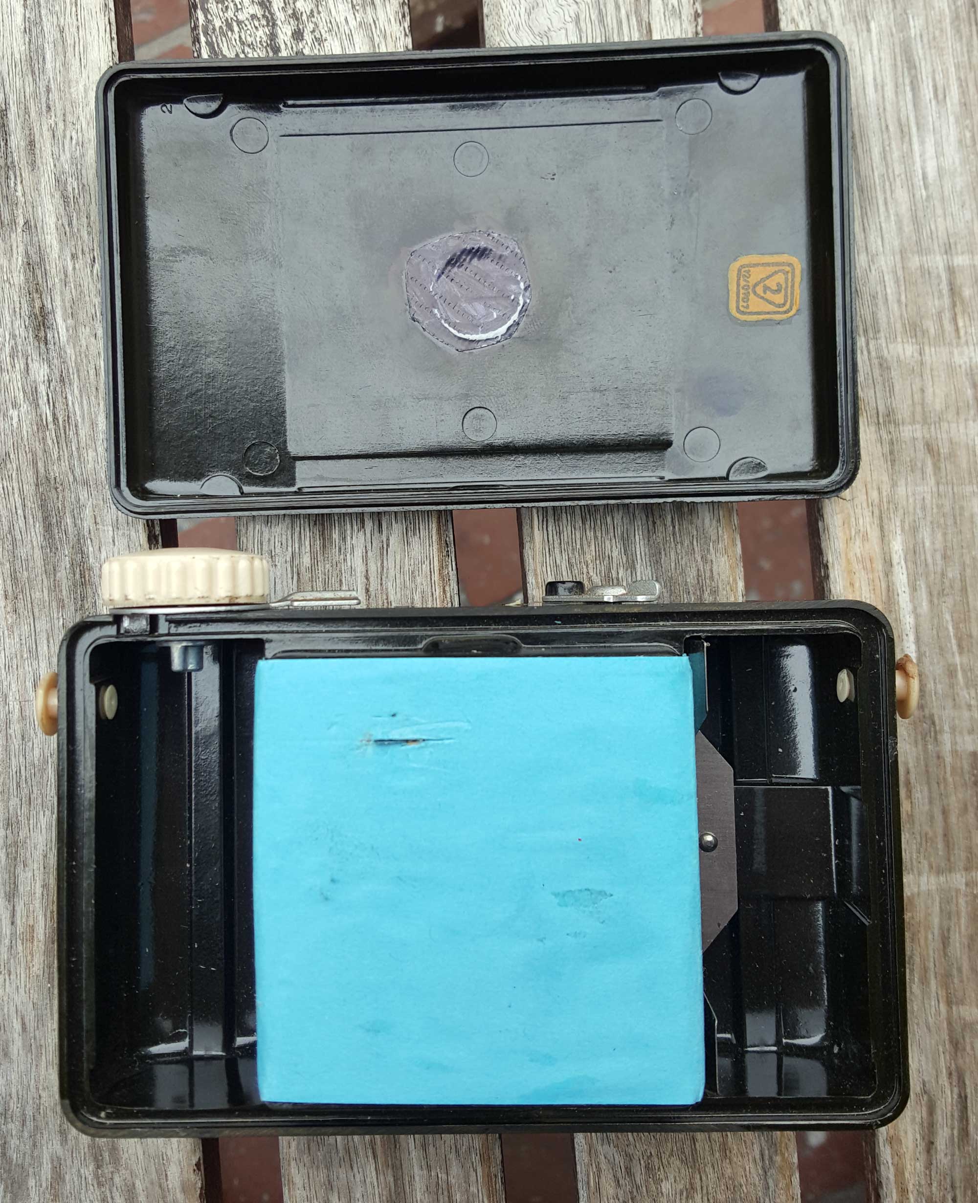 ich habe mal versucht einen Schneider für 129er Film (und 127er Film) zu basteln. Grundlage war eine defekte Pouva Start (fehlender Sucher). Das Objektiv wurde entfernt und in den Innenraum eine passende Holzplatte eingebaut. Darüber kam noch eine Lage Papier, um den Film zu schonen und an der entsprechenden Stelle wurde ein Stück Rasierklinge eingesetzt. Ursprünglich wollte ich noch eine dünne Polsterung an der Kamerarückwand aufbringen, aber da bei der Pouva die Rückwand als Filmandruckplatte fungiert, ließ sich der Film nicht mehr drehen (zu straff eingepresst). Der Schneider hat für den ersten Film tadellos funktioniert, allerdings besteht noch Verbesserungsbedarf. Die Rasierklinge hat sich beim Schneiden weiter ins Holz hineingedrückt – die muss also besser befestigt werden (hatte sie nur lose reingesteckt, werde sie beim nächsten Mal aber einkleben). Eventuell braucht auch die Rückwand noch eine passende Vertiefung zur Aufnahme der Rasierklinge. Ob der Film beim Schneiden Kratzer abbekommen hat, wird sich zeigen, wenn er belichtet und entwickelt ist.