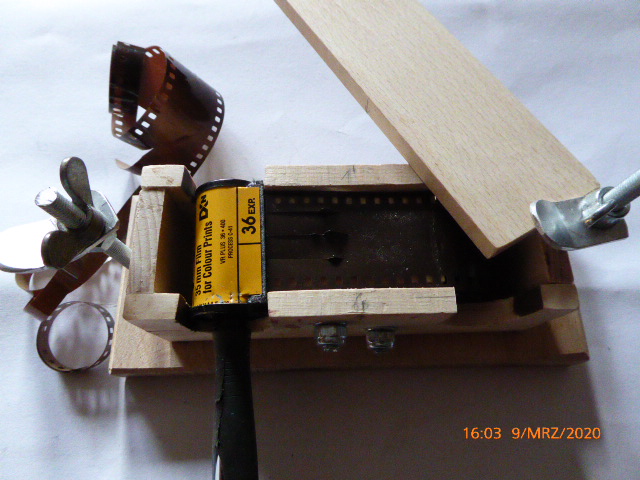 Interessant fand ich noch eine Bauanleitung mit einer Kamera.Da wird nur das Schneideteil in die Filmrückwand eingesetzt und mit der Kurbel durchgedreht. Gute Idee....