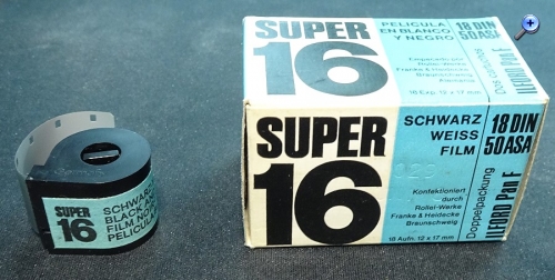 Wirgin Edixa 16. 12x17 mm. Es passen auch die unperforierten Rollei 16 mm Film-Patronen.