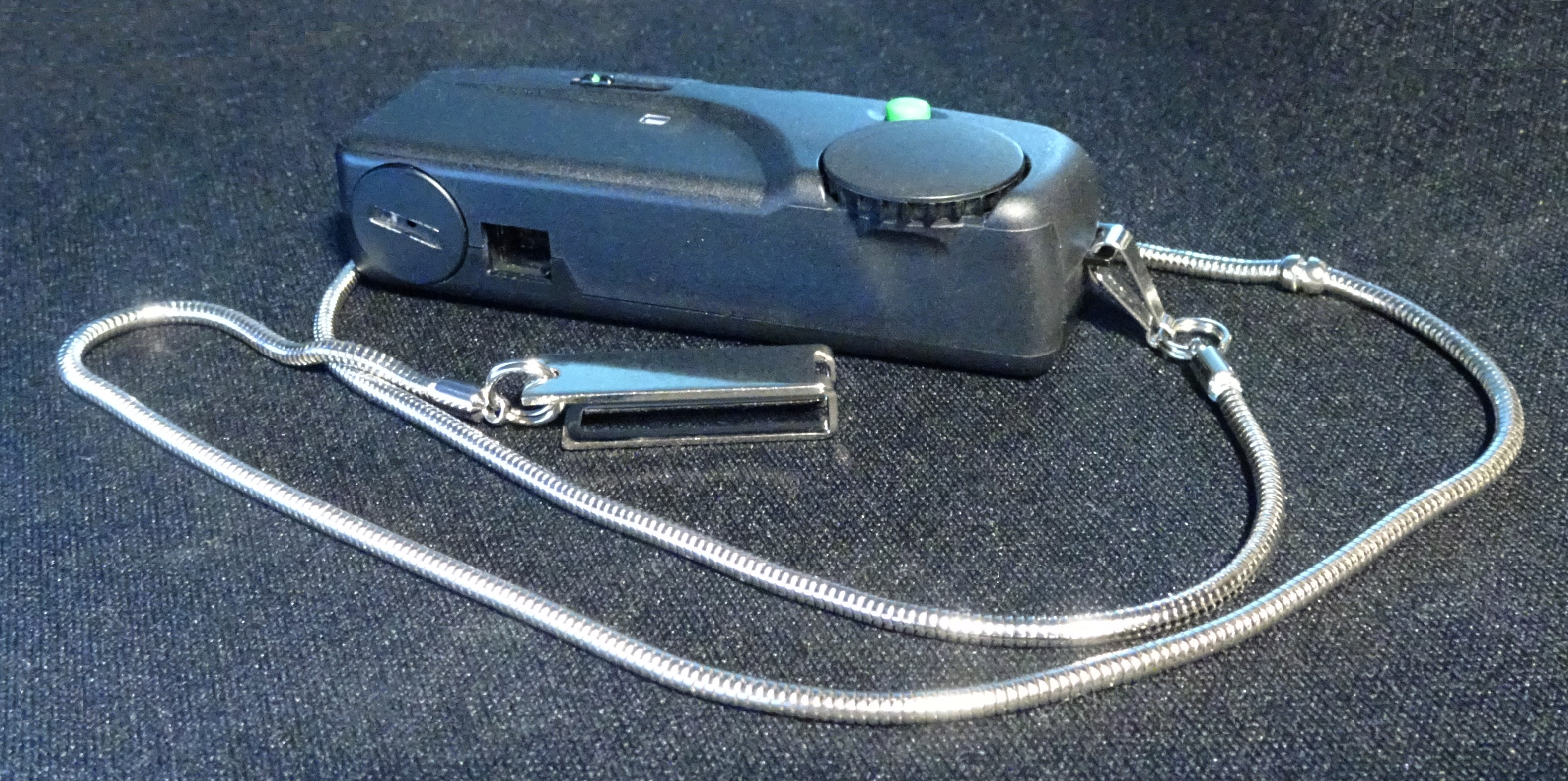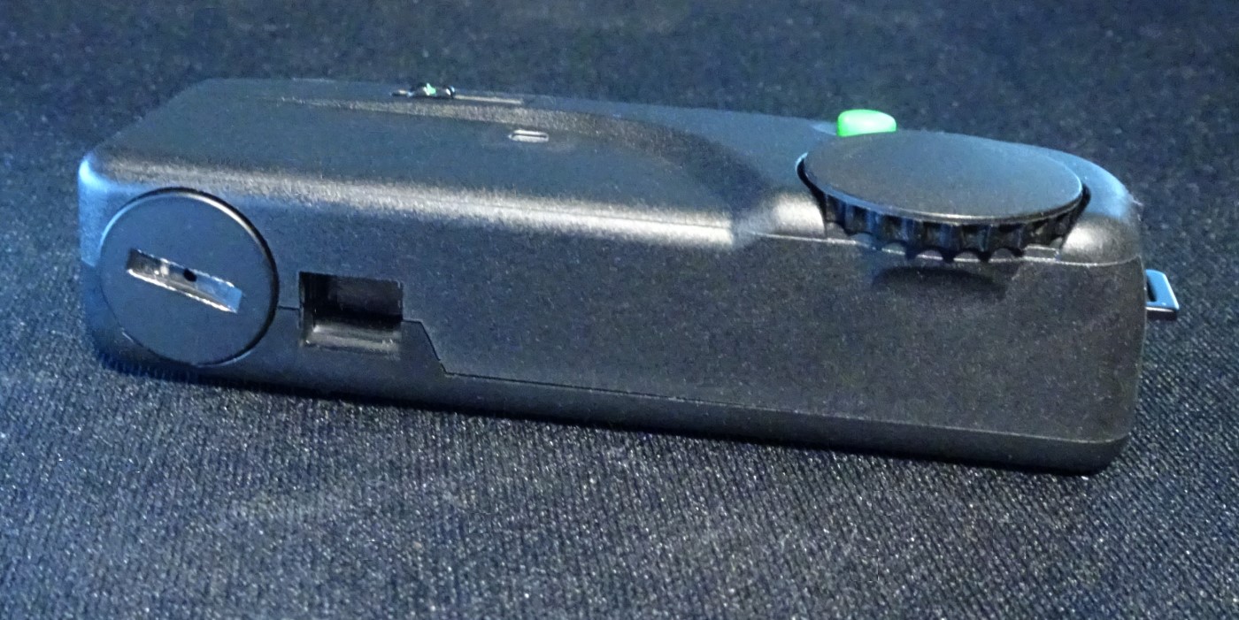 Sonstiges: Tragekette mit Mess-Marke bei Nahaufnahmen und Clip zur Gürtelanhängung, Langzeit-LED rot, LED grün für Verschluss offen. Schutzschieber an Frontseite, der auch die Kamerafunktionen aktiviert. Filmtransport mit Drehrad oben. Kleiner Schieber an Unterseite zur Langzeitkontrolle.