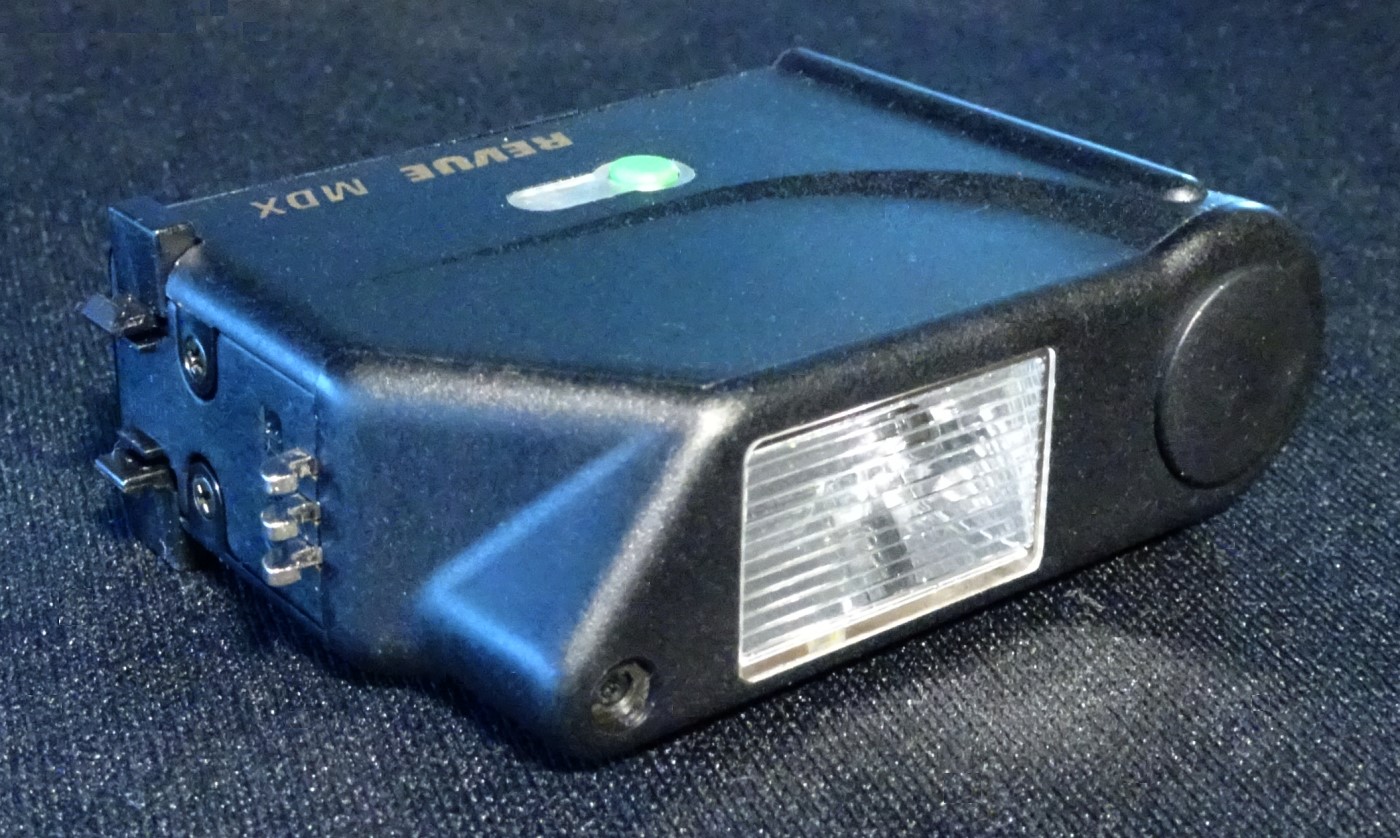 Blitzgerät: Revue MDX, Leitzahl 8 bei ASA 100. Mit Lichtsensor, Batterie CR3, je nach Film-ASA 0,3 Meter bis 3 Meter. Anstecktyp via 3-Kontaktleiste. Automatische Abstellung.