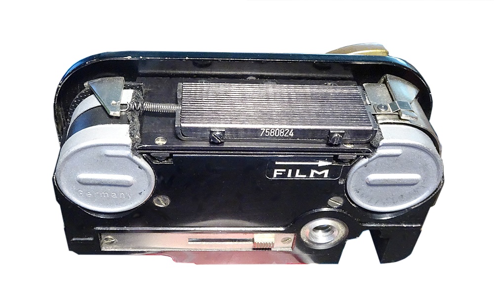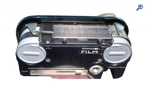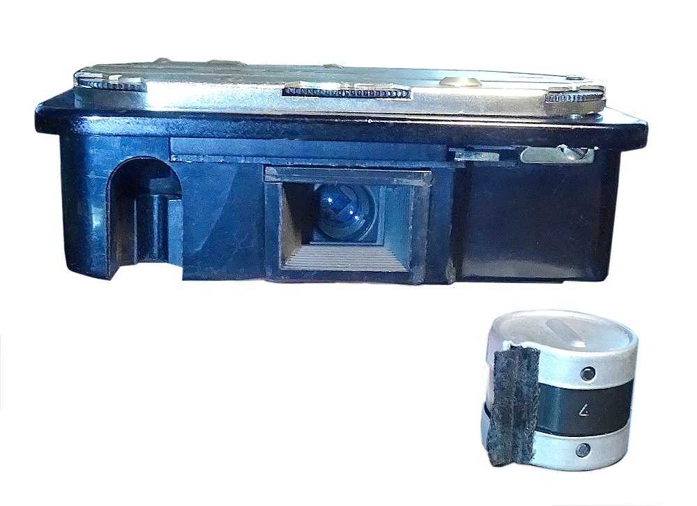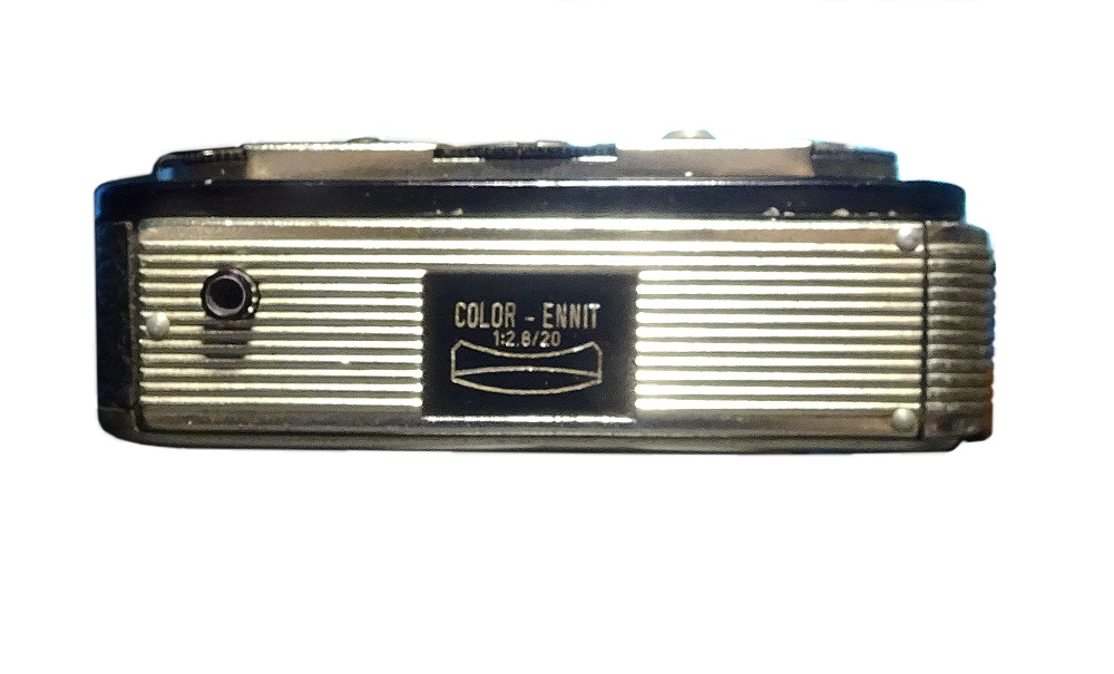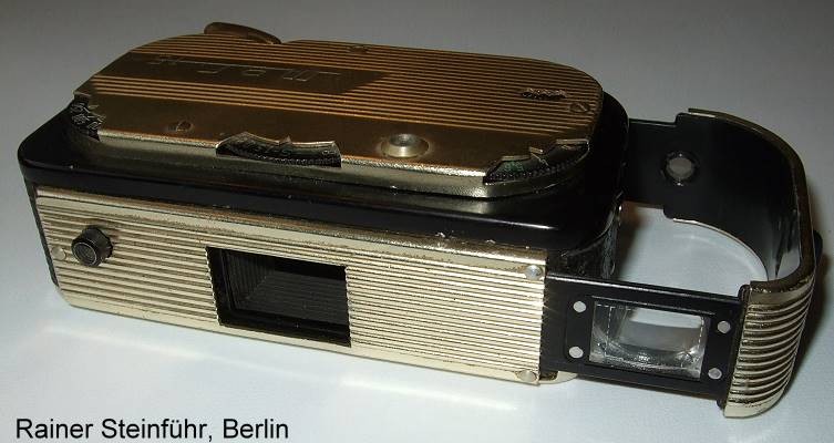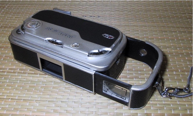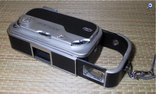 eine weitere Miniaturkamera die die Bedienung von Blende, Zeit (sogar bis 1/1000 Sek.) und Entfernung zuläßt. Der Sucher muß zum Fotografieren ausgezogen werden, das geht etwas schwer, wenn nicht die Tragekordel angeschlossen ist. Ergonomisch liegt der Auslöser an der Vorderseite etwas ungünstig. Die Kamera hat aus Sicht der fünfziger Jahre ein durchaus elegantes Aussehen. Der ÖffnungsTaster (zum Filmpatronen-Wechsel) ist erreichbar, wenn die Suchereinheit herausgezogen ist.