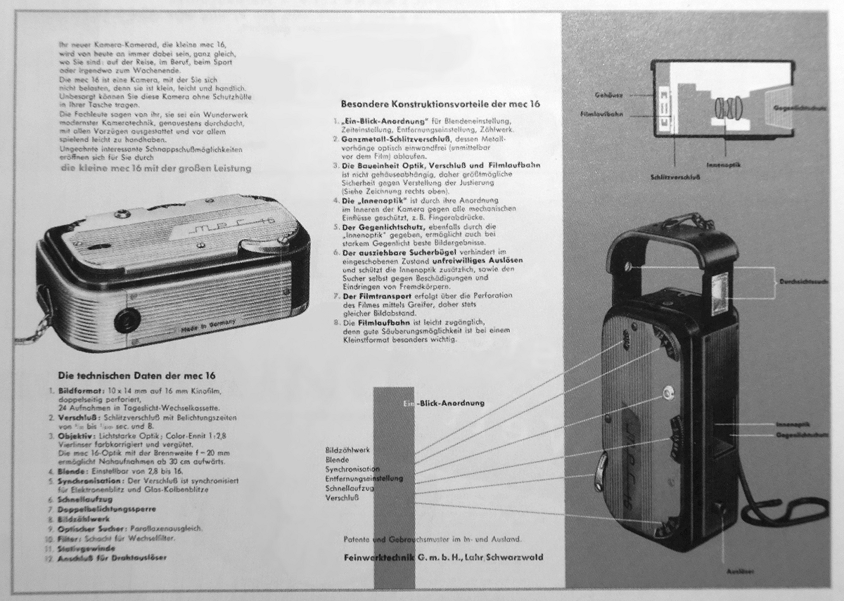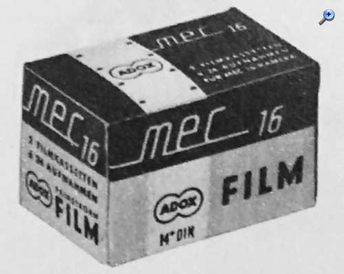 MEC16 / MEC 16SB: Zubehör: Leder-Tasche, Blitzgerät, Tragekette. Filme SW: Adox KB14 (200 ASA). Super Hypan (500 ASA), weitere Filme Farbe: Kodachrome (10 ASA). Anscochrome (32 ASA). SuperAnscochrome (100 ASA), weitere
