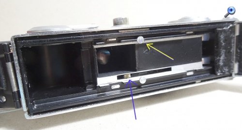 Filmtransport: Kombiniert mit Schiebesucher, Rückspulkurbel. Der Film wird aus der Patrone mit Perforationsgreifer in die Leerkammer geschoben und später von dort mit der Kurbel zurück in die Patrone geführt. Etwas anfälliges Konzept. Deshalb wurde beim Modell 16S ein Doppelter Perforationsgreifer verwendet.