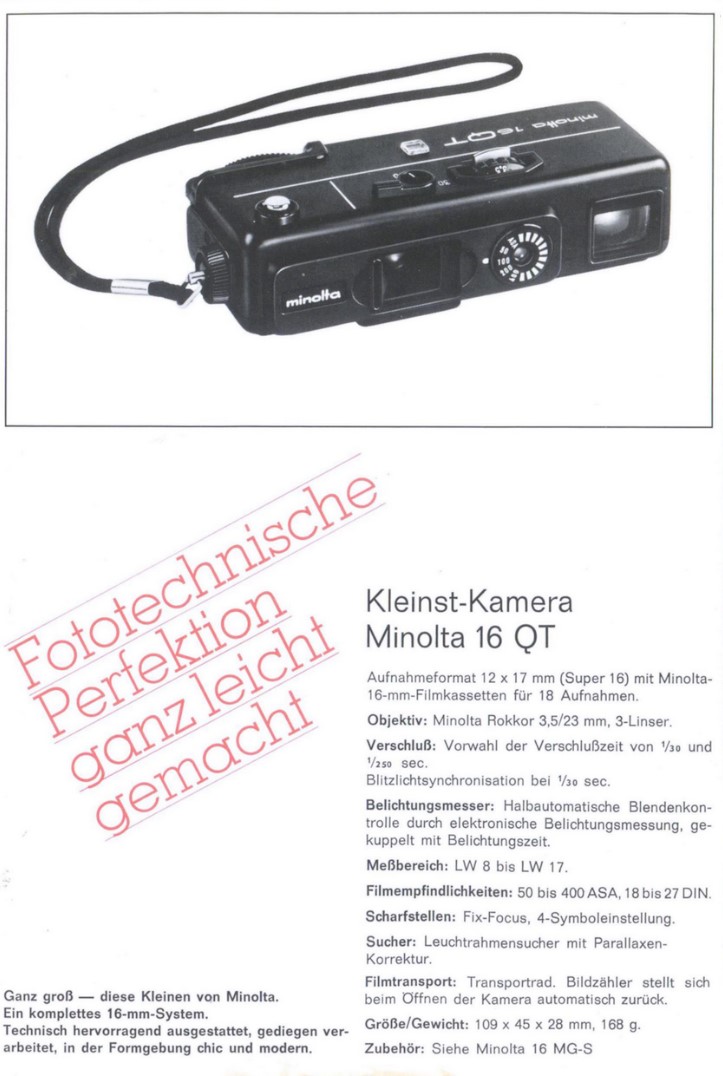 Produktwerbung zur Minolta 16QT im Jahr 1973. Durchaus sachliche klare Werbung als Beschreibung: