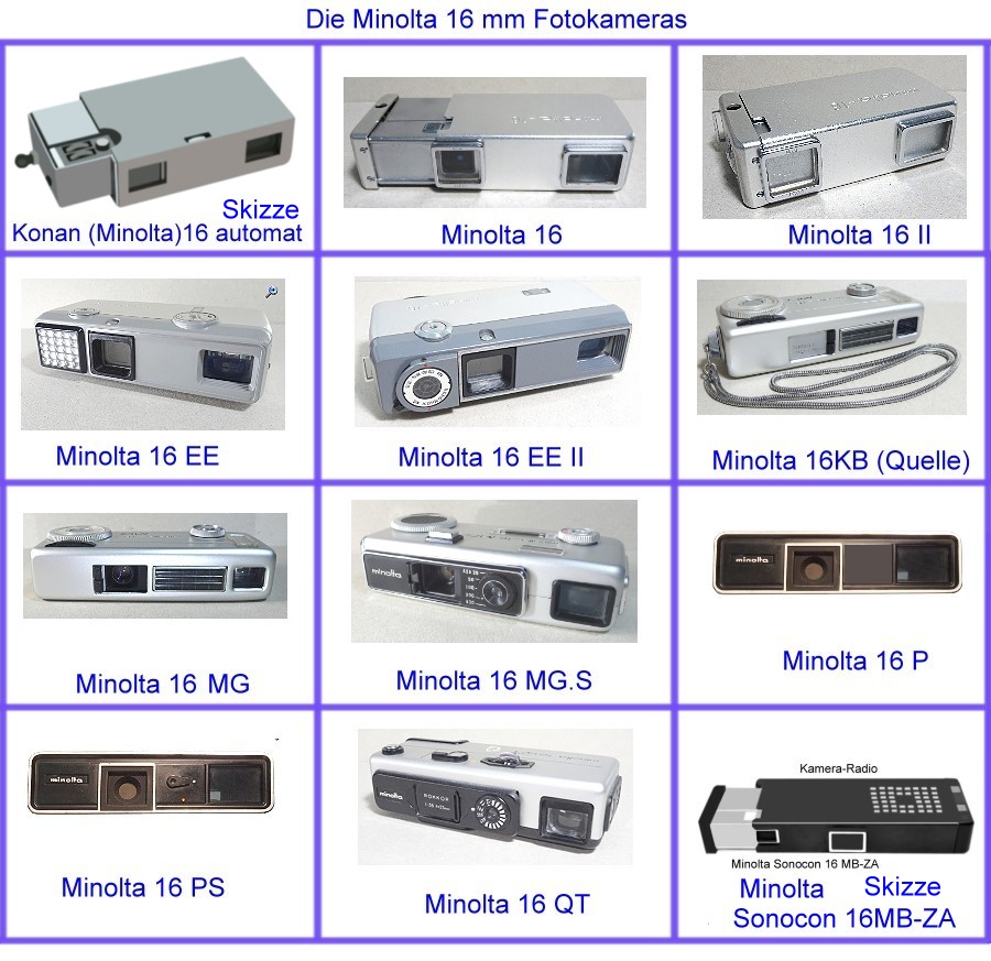 Minolta stellte eine Reihe von kompakten Kleinstbildkameras für 16 mm Film her, die hier aufgelistet werden, also ohne Pocket-110 Film Format-Modelle.