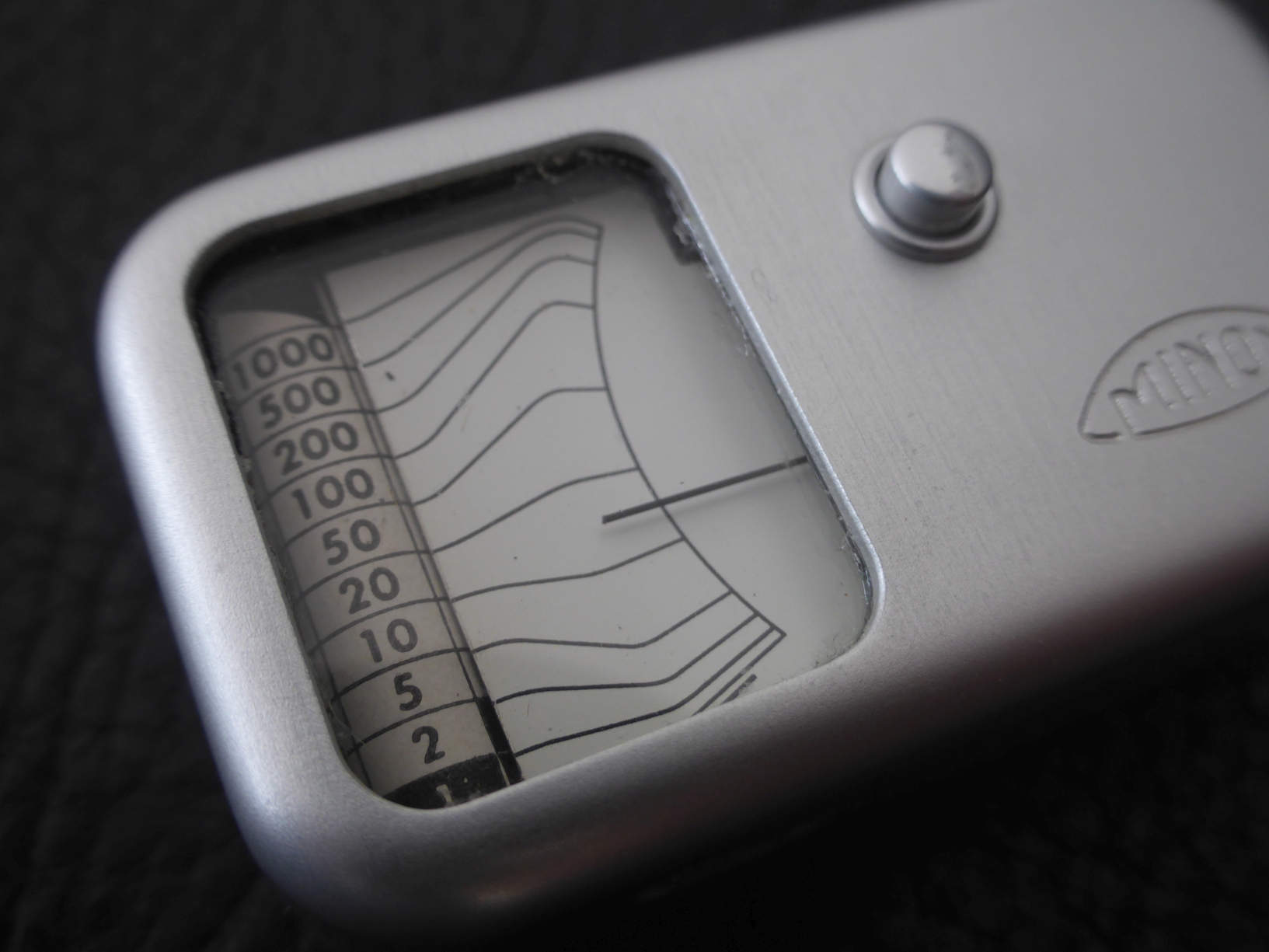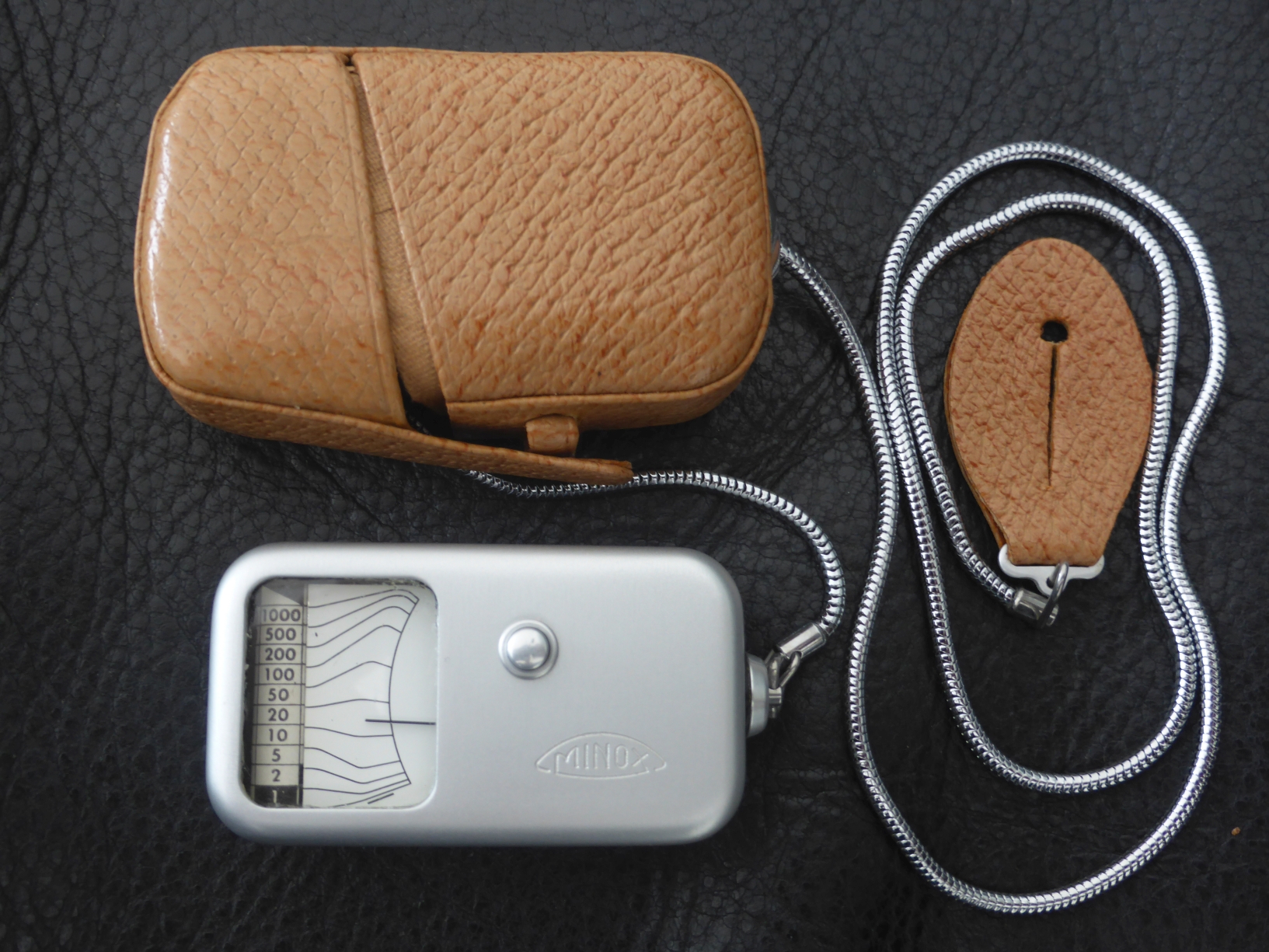 da die Minox A über keinen eingebauten Belichtungsmesser verfügte, bot Minox ab 1951 einen hochwertigen externen Belichtungsmesser an, der speziell auf die Minox A abgestimmt war. Bei Erscheinen war er wahrscheinlich der kleinste Belichtungsmesser weltweit. Es handelt sich um ein Selen-Fotoelement hinter einer Wabe, bei dem keine Stromversorgung (Batterie) erforderlich ist. Die Anzeige erfolgt über ein federnd in Steinen gelagertes Drehspulinstrument .