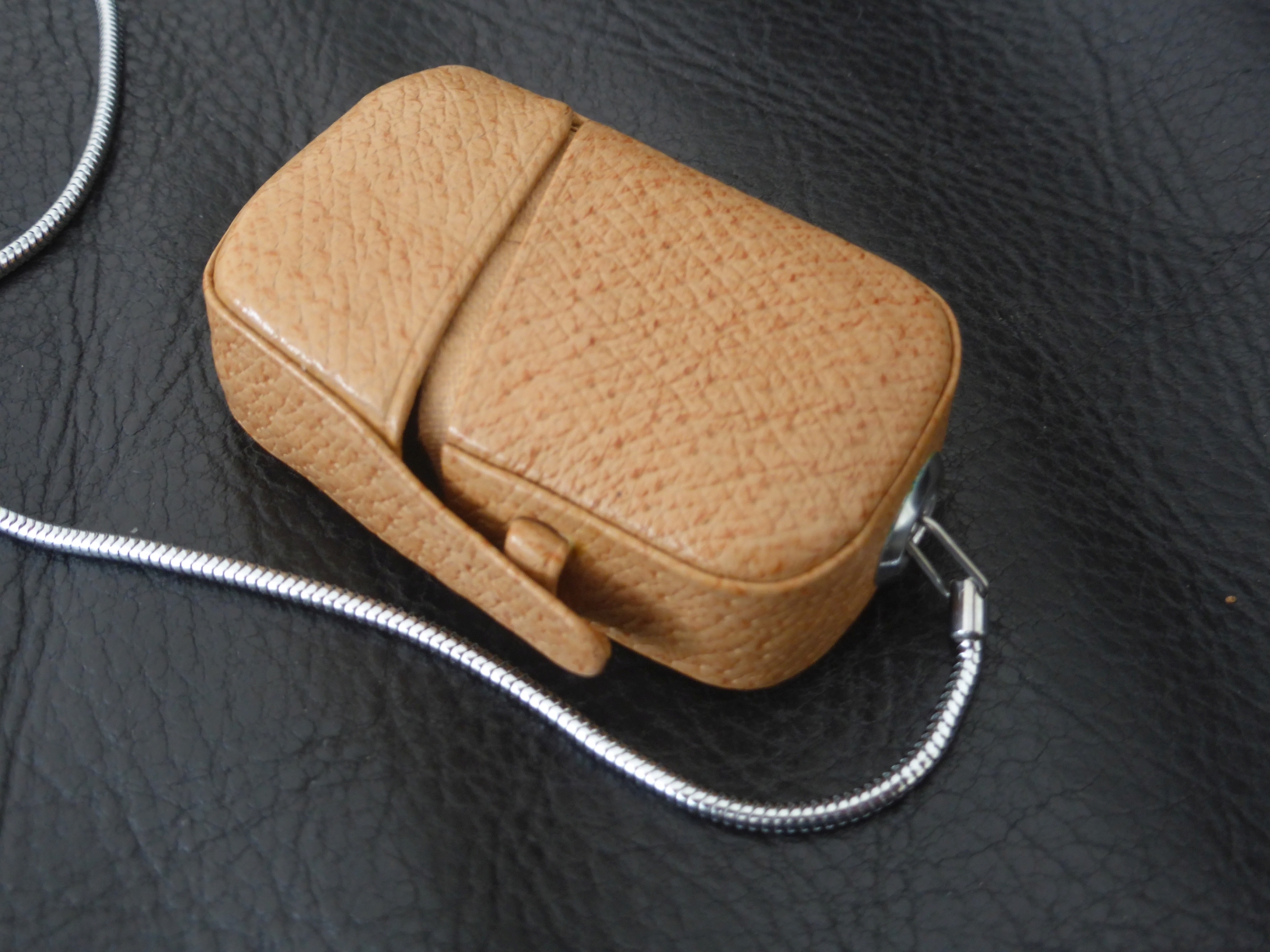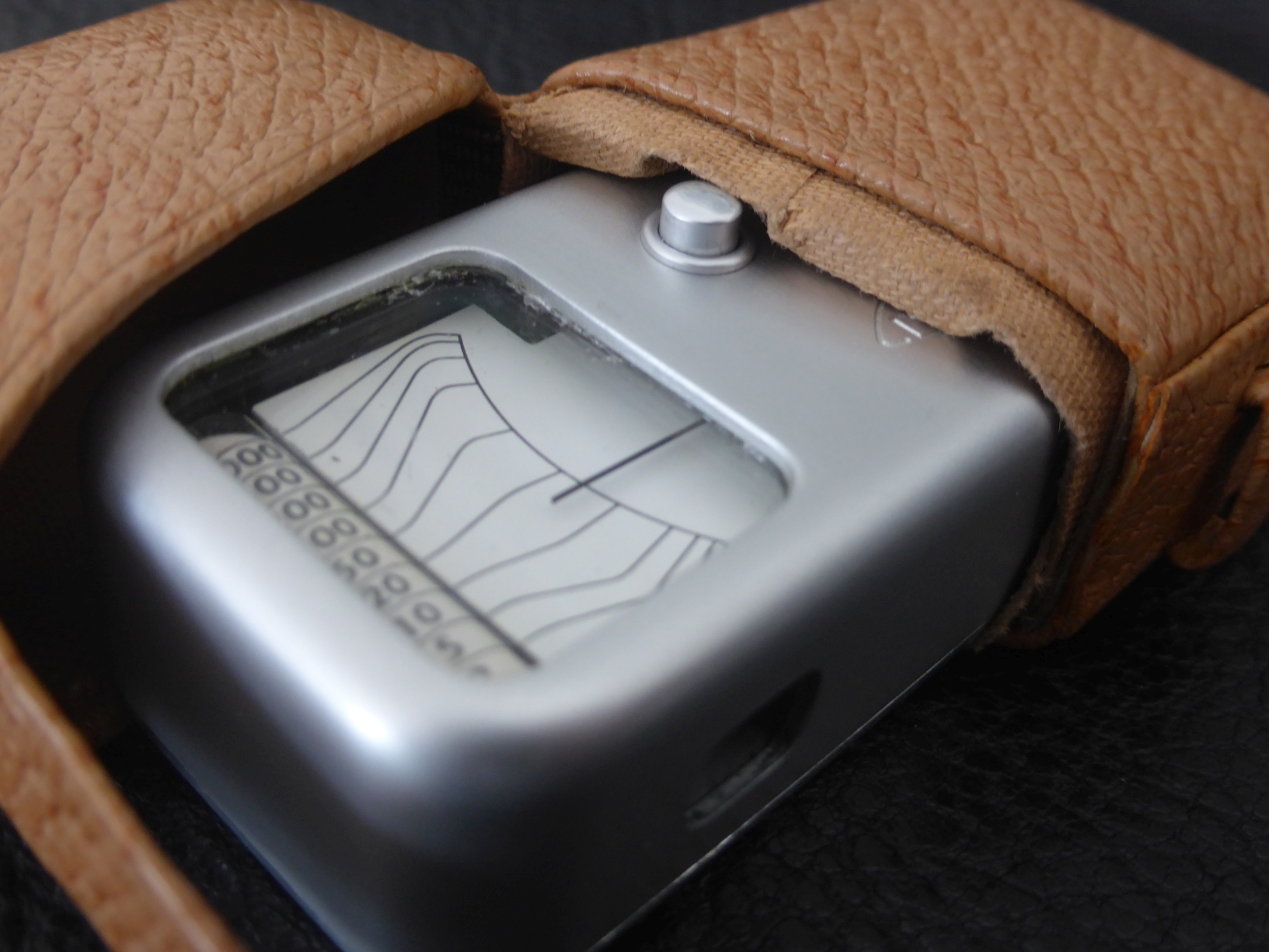 Die Minox-typische Liebe zum Detail zeigt sich an der Ausgestaltung des Etuis. An der Seitenwand ist eine exakt passende Nut eingearbeitet, die sicherstellt, dass der Meßknopf im Etui frei bleibt und somit das Drehspulinstrument immer arretiert und damit vor Stößen geschützt ist: