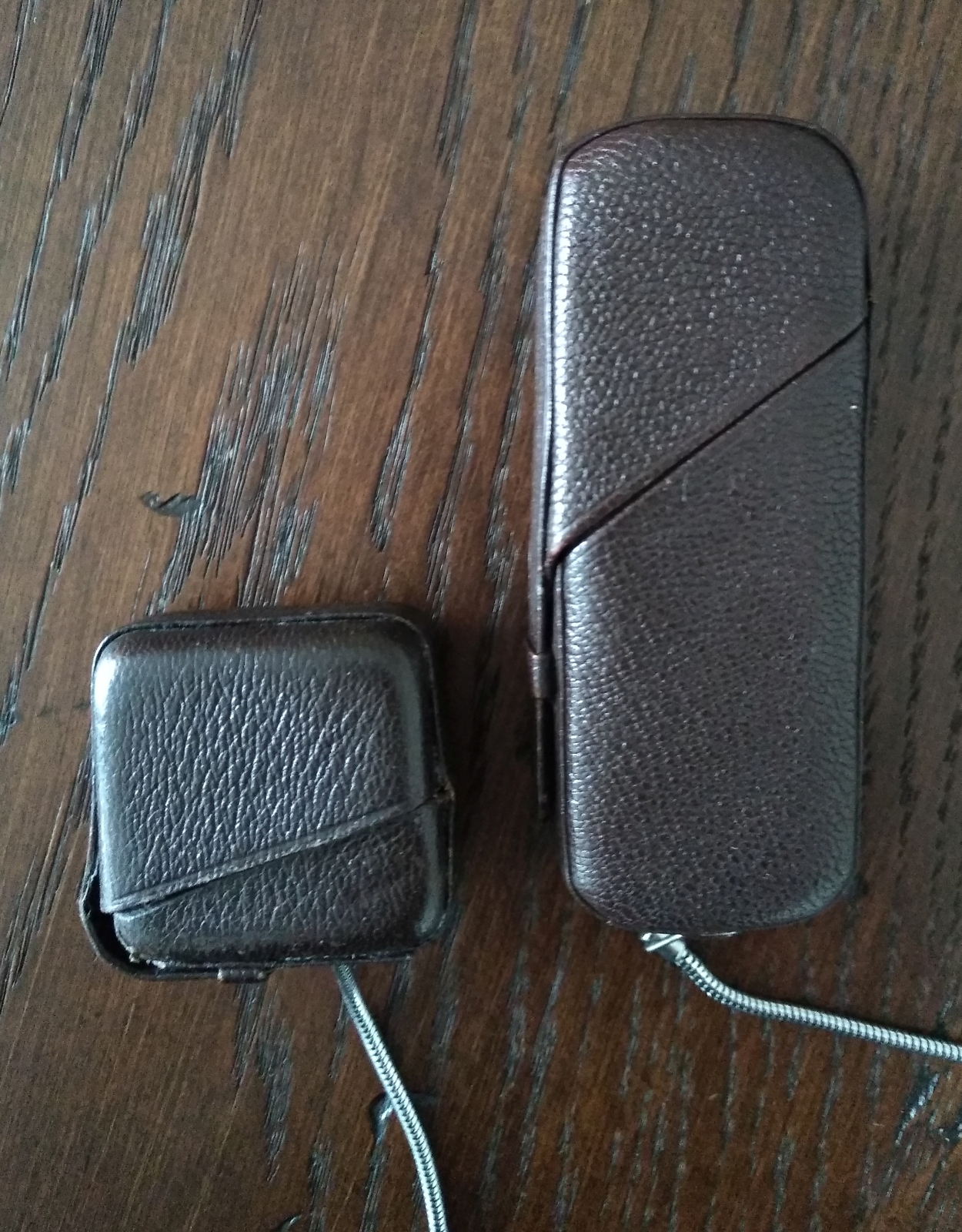Der Eigenbau war simpel. Er besteht aus dem abgetrennten Oberteil einer Minox B. Schwieriger war der Bau der Lederhülle. Diese basiert auf der verkleinerten Tasche einer Minox B. Hier der neue Belichtungsmesser und eine Minox A in ihren Taschen: