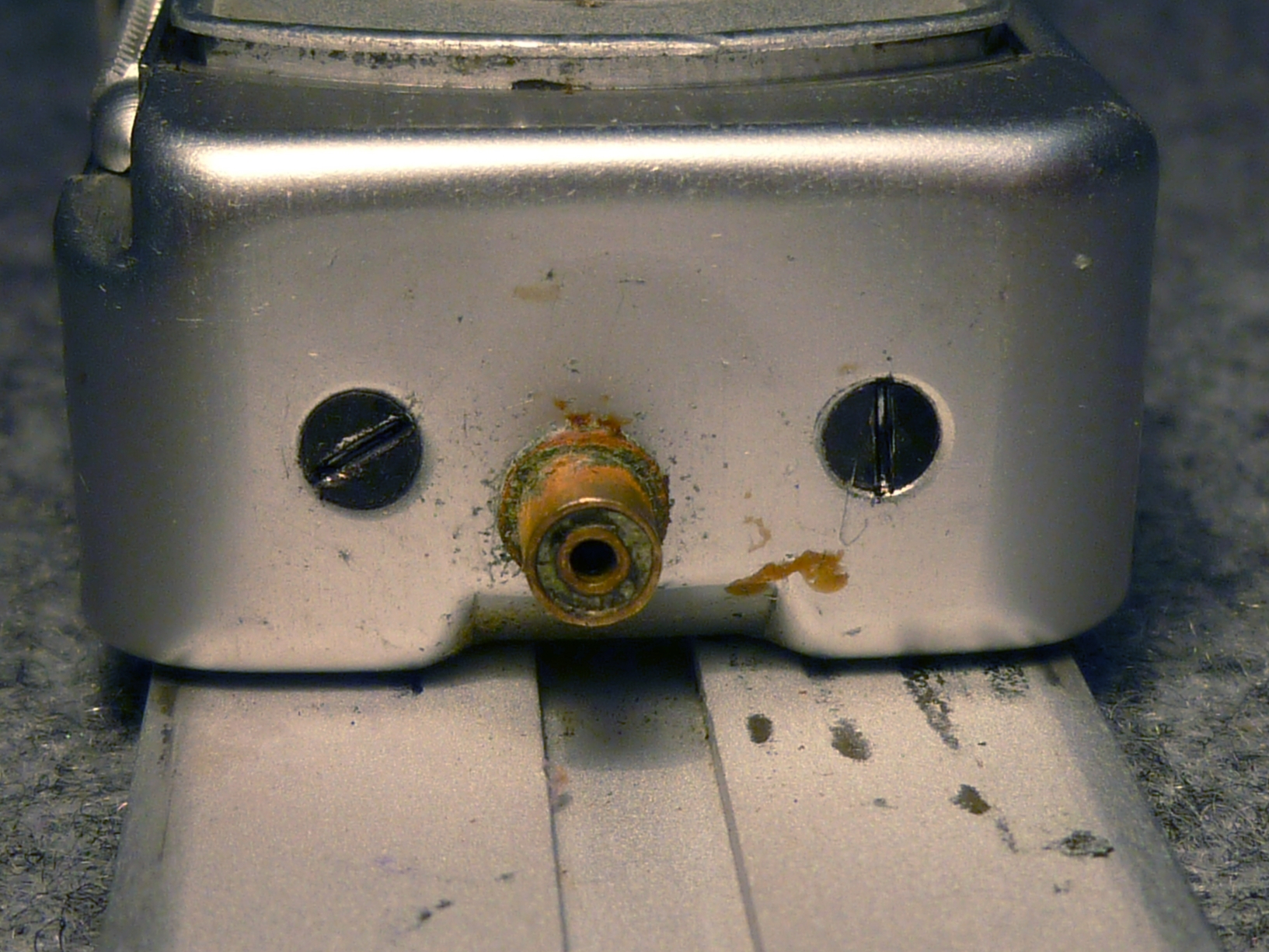 Stattdessen habe ich an den horizontalen Spalten, wo die Gehäuseteile jeweils aufeinander gleiten, vorsichtig Benzin aufgebracht. Aufpassen musste ich, dass auf keinen Fall zuviel Benzin auf einmal in die Kamera geriet und eventuell Spuren auf den Linsen hinterliess. Dazu war teilwiese überkopf Arbeiten nötig, um die Flüssigkeit immer von der Linse wegfließen zu lassen. Letztlich konnte ich den klebrigen Schmierfilm anlösen und mit einer sehr feinen Interdentalbürste teilweise heraus bekommen. Der Rest ließ sich durch mehrfaches Auseinanderzeihen und Zusammenschieben der Kamera so von den Gleitflächen schieben, dass die Reibung erheblich geringer wurde. Danach war die Betätigung leichtgängig genug, um mit der Kamera zu arbeiten. Mit diesem Kompromiss konnte das komplette Zerlegen der Kamera vermieden werden.