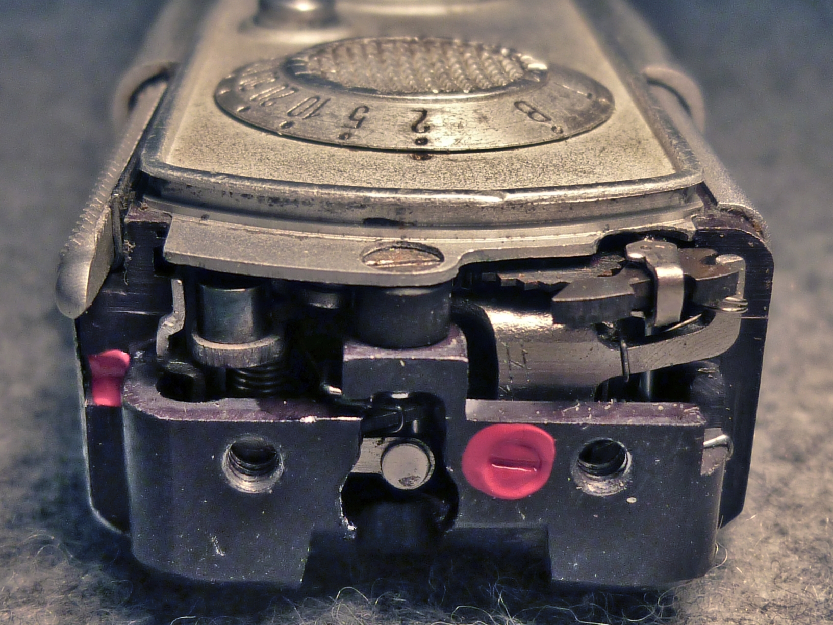 Wie habe ich es gemacht? Es galt, die Kamera so wenig wie möglich zu öffnen bzw. zu demontieren, um auf keinen Fall die Verschlusslamellen zu beschädigen. Diese sind nämlich über zwei Zugfedern direkt an der Zahnstange befestigt, die beim Auseinanderziehen des Gehäuses den Verschluss spannt, das Hemmwerk zurücksetzt und den Film transportiert. Die Befestigung der Zahnstange am Gehäuse kann nur ohne Sicht bei gespanntem Verschluss gelöst werden, was dazu führen kann, dass die Spannung auf die Lamellen schlagartig nachlässt. Das Risiko, dabei die nur 0,04 mm (!) dünnen und 0,08 g leichten Lamellen zu beschädigen, ist groß.