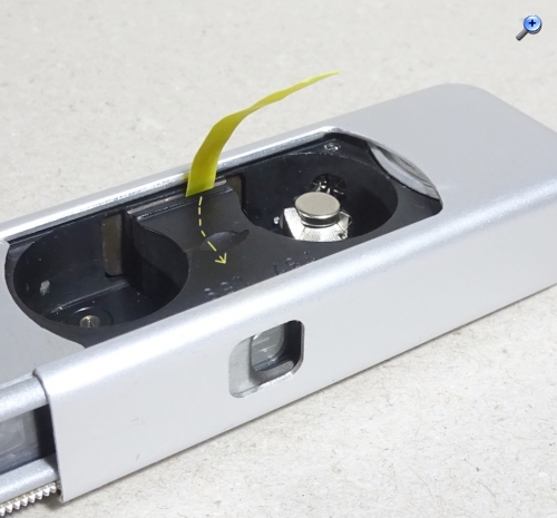 2) In diese Öffnung kann jetzt ein dünner schmaler gebogener Papierstreifen eingeschoben werden (Vielleicht mit Pinzetten-Unterstützung), siehe Foto 2. Gelingt es, diesen Papierstreifen weit einzuschieben während er n die Filmkammer gleitet, befindet sich dort keine Filmlinse, das Objektiv ist ein 4-Linsen Complan! Gelingt es nicht, ist es ein 5-Linser. Durch die Papiervorbiegung rutscht der Streifen leicht in die Kammer zwischen Objektiv und Filmführung, wenn dort keine Filmlinse "lauert".