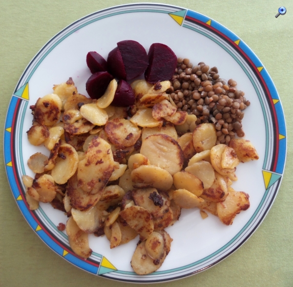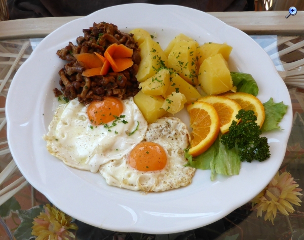 oft bin ich in dem Umland von Berlin unterwegs. Immer wieder kehre ich auch dabei in Restaurants und Gasthäusern ein. Bei einem Besuch eines rudimentär geführten Dorf-Gasthauses (weit und breit keine Alternative) wurde mir unter der Speisenkarte-Bezeichung "Fredys Bauernfrühstück" das folgende Gericht serviert: