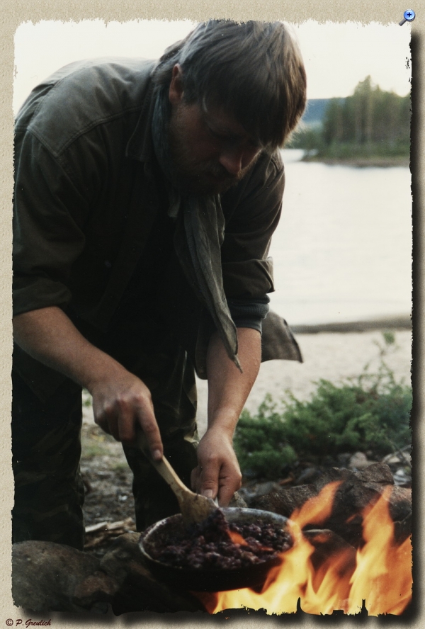 So...und jetzt mal Schluss mit lustig und gepflegter Esskultur (sofern man Currywurst noch dazu rechnen darf). In jedem Mann steckt noch ein Neandertaler, der gern am Feuer herumbrutzelt. So wird es jedenfalls immer gern von Kabarettisten und Komikern behauptet. Während unserer Touren mit Touristen konnte ich mich in dieser Hinsicht so richtig austoben. Dies Bild zeigt meinen Versuch, auf offenem Feuer Pfannkuchen mit frisch gesammmelten Blaubeeren herzustellen. Es ist dann aber eher so eine Art violettblauer Kaiserschmarrn geworden. Auch wenn er seltsam aussieht...geschmeckt hat das Zeugs trotzdem.