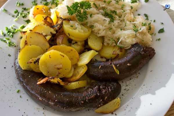 Wenns deftiger sein soll: Blunzen mit Erdäpfeln und Kraut (Blutwurst mit Kartoffeln)