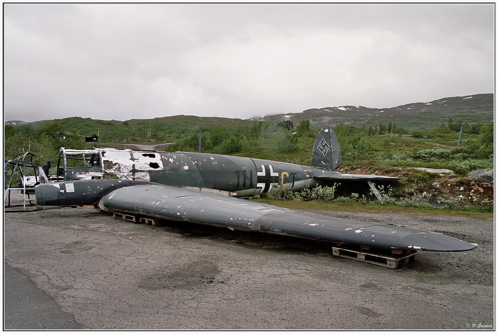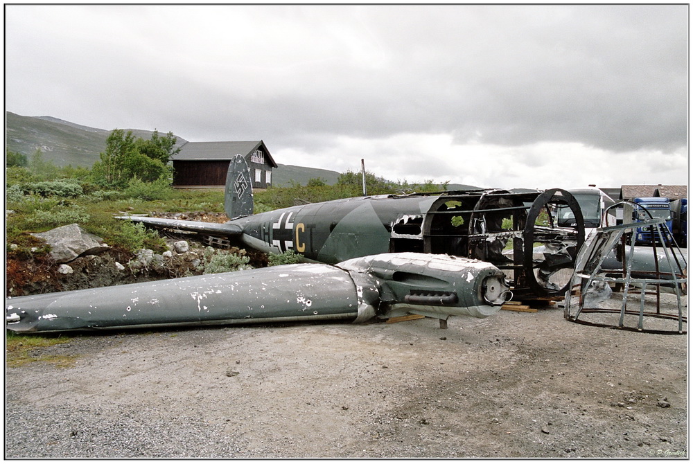 Also...wir staunten jedenfalls nicht schlecht, als wir im Sommer 2013 an einem Hotel in den norwegischen Bergen vorbeifuhren und auf dem Parkplatz dieses Flugzeug sahen. Man hatte es aus dem Gelände in der Nähe geborgen, wo es während des 2. Weltkrieges abgeschossen wurde und notgelandet war.