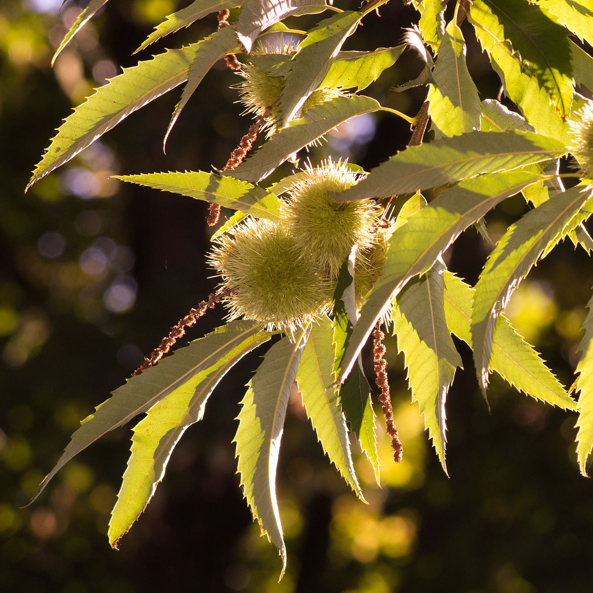 Heuer haben die Edelkastanien im Donautal zum ersten mal größere Früchte entwickelt - wohl eine Folge des extrem heißen Sommers - und leuchten im warmen Herbstlicht.